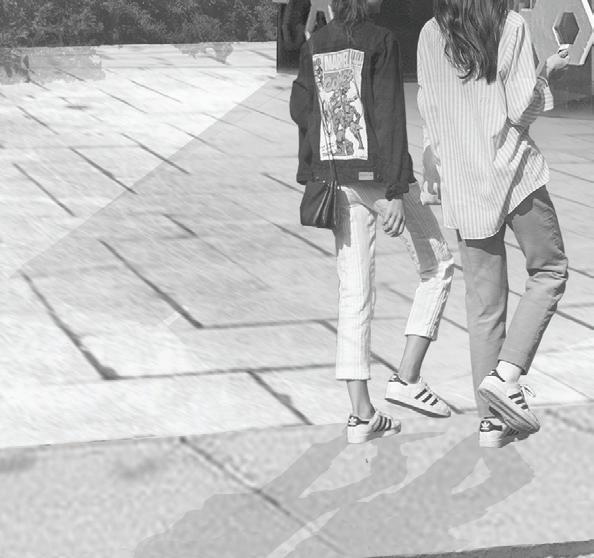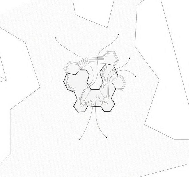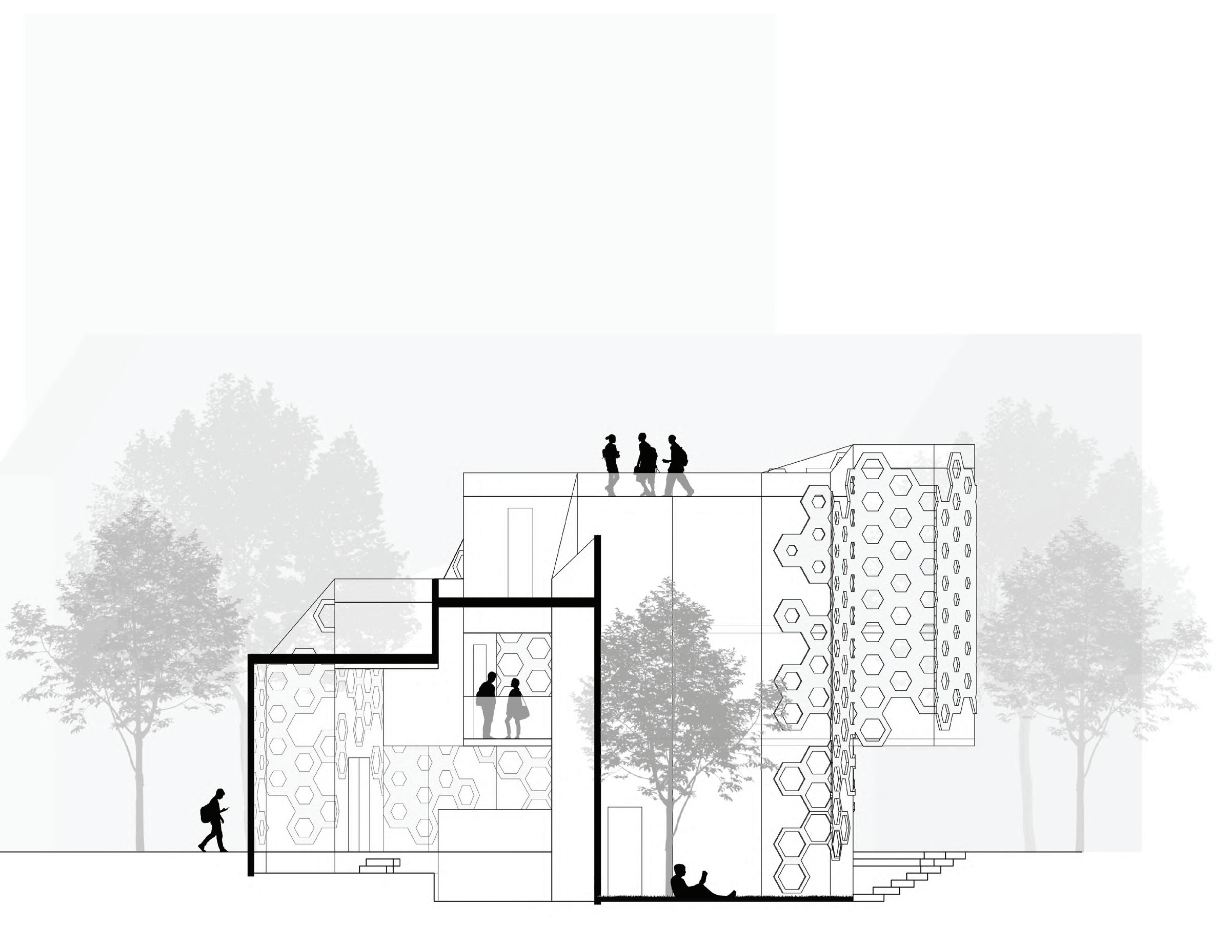 GREEN SPACES: The relationship between students and the campus environment is important in their overall academic experience. By designing a series of green spaces, students are able to enjoy a change in scenery and socially engage with one another. The green roof and back courtyard offers additional areas of congregation, while smaller gathering spaces can be found under the cantilevered hexagonal chambers for a more intimate setting.