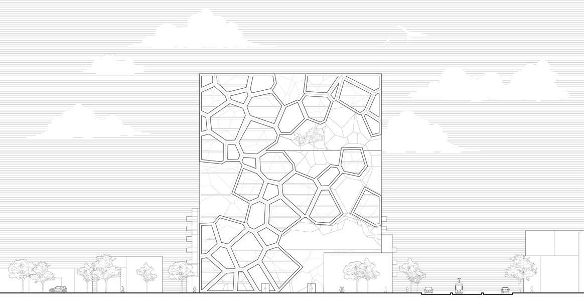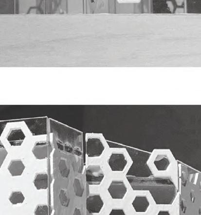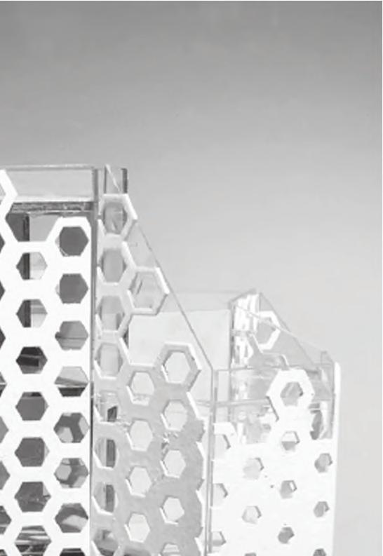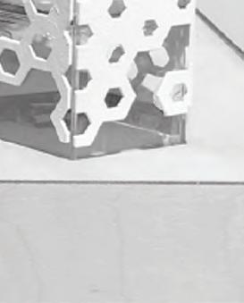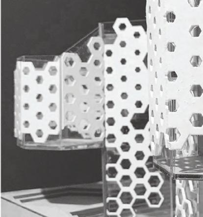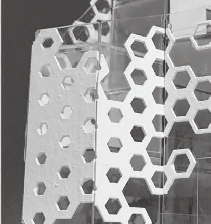 FACADE: Serving as windows, the facade imitates the honeycomb pattern to indicate the level of privacy in certain areas of the building. The size of the hexagonal openings on the facade correspond to the privacy of each floor as it gradually increases and decreases both vertically and horizontally. With the largest openings towards the main entrance on the ground floor, the pattern shrinks as it moves upwards where the private study rooms are located.