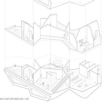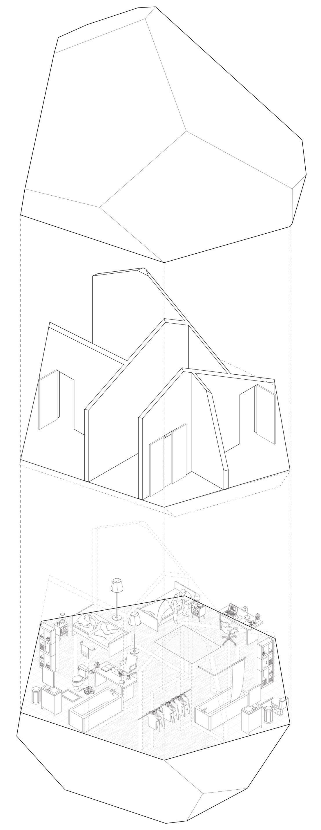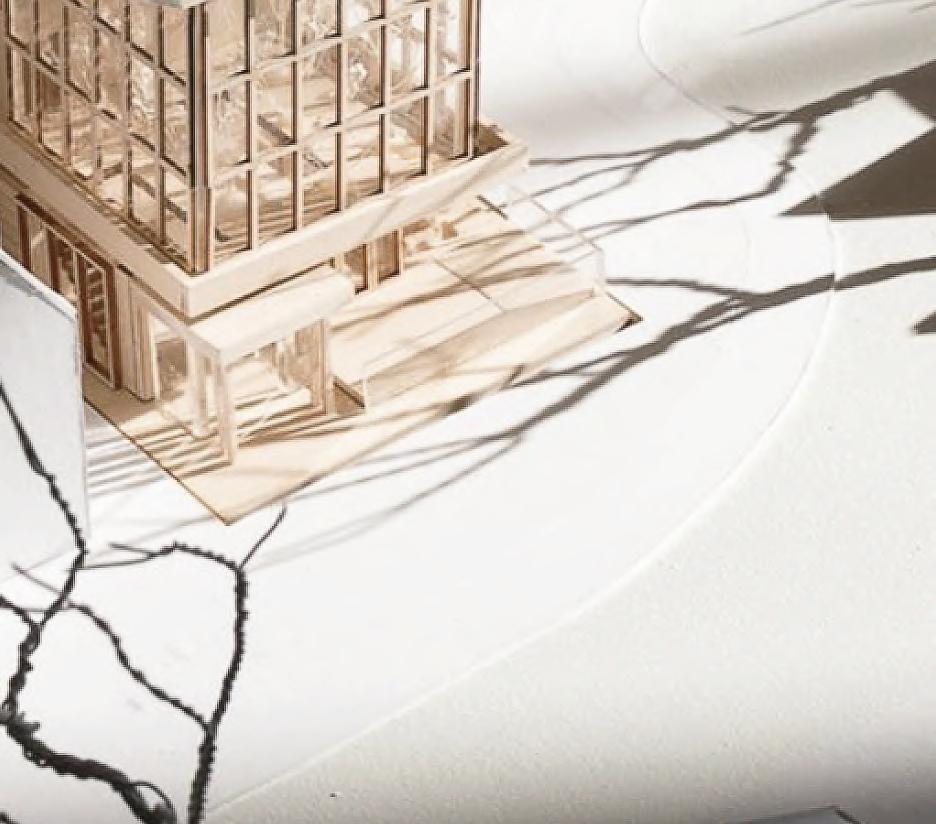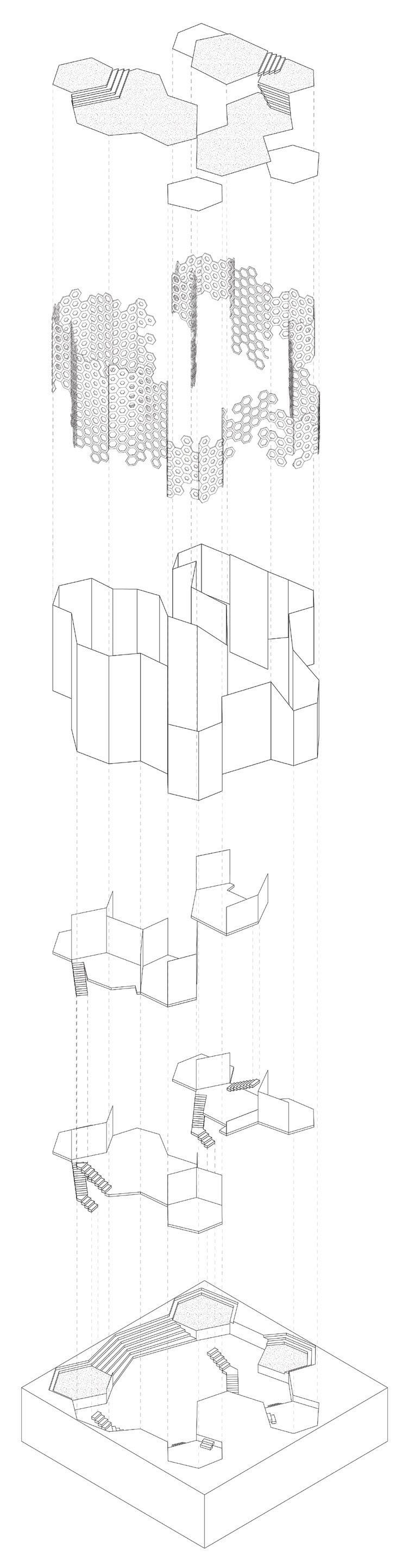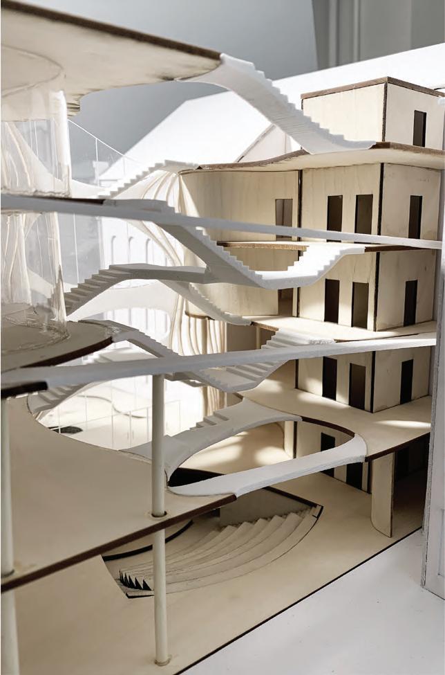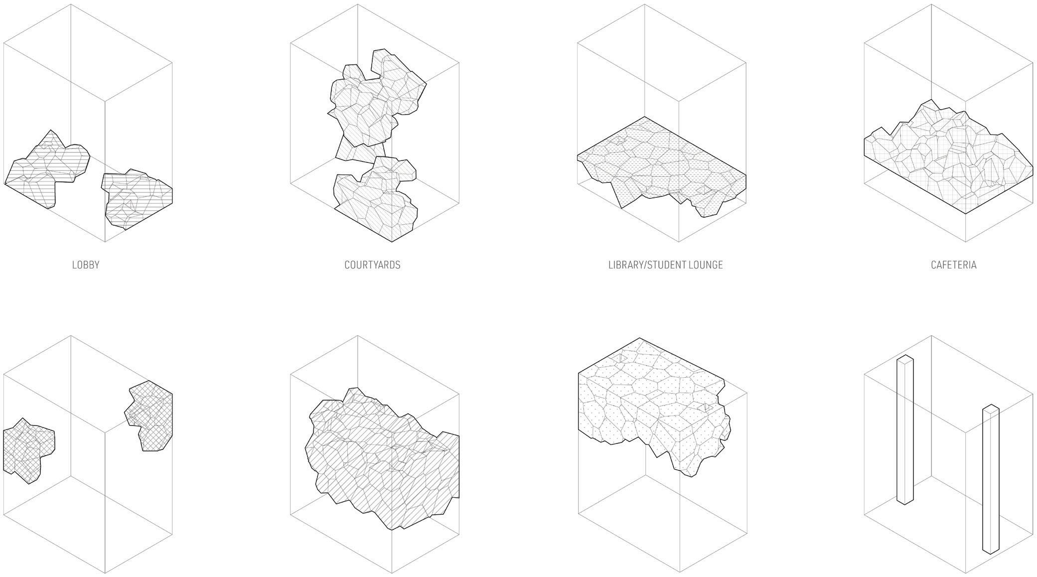 Located in an urban academic campus in Everytown, the site occupies a space between two landmarked buildings that house the Art and Architecture Schools of Pratt Institute. The project aims to design a connecting structure that acts as a central unified lobby for the two schools. Serving as a collective meeting point for all the students from both schools, the structure creates cohesion between the differentiating floor heights of the two existing buildings through a central circulation system within an open atrium. Staircases, ramps, and other circulational means act as the main organizing principle between public and private programs, collective and discrete spaces, the partition of light and dark zones, and the transitional threshold between the exterior and interior of the building.