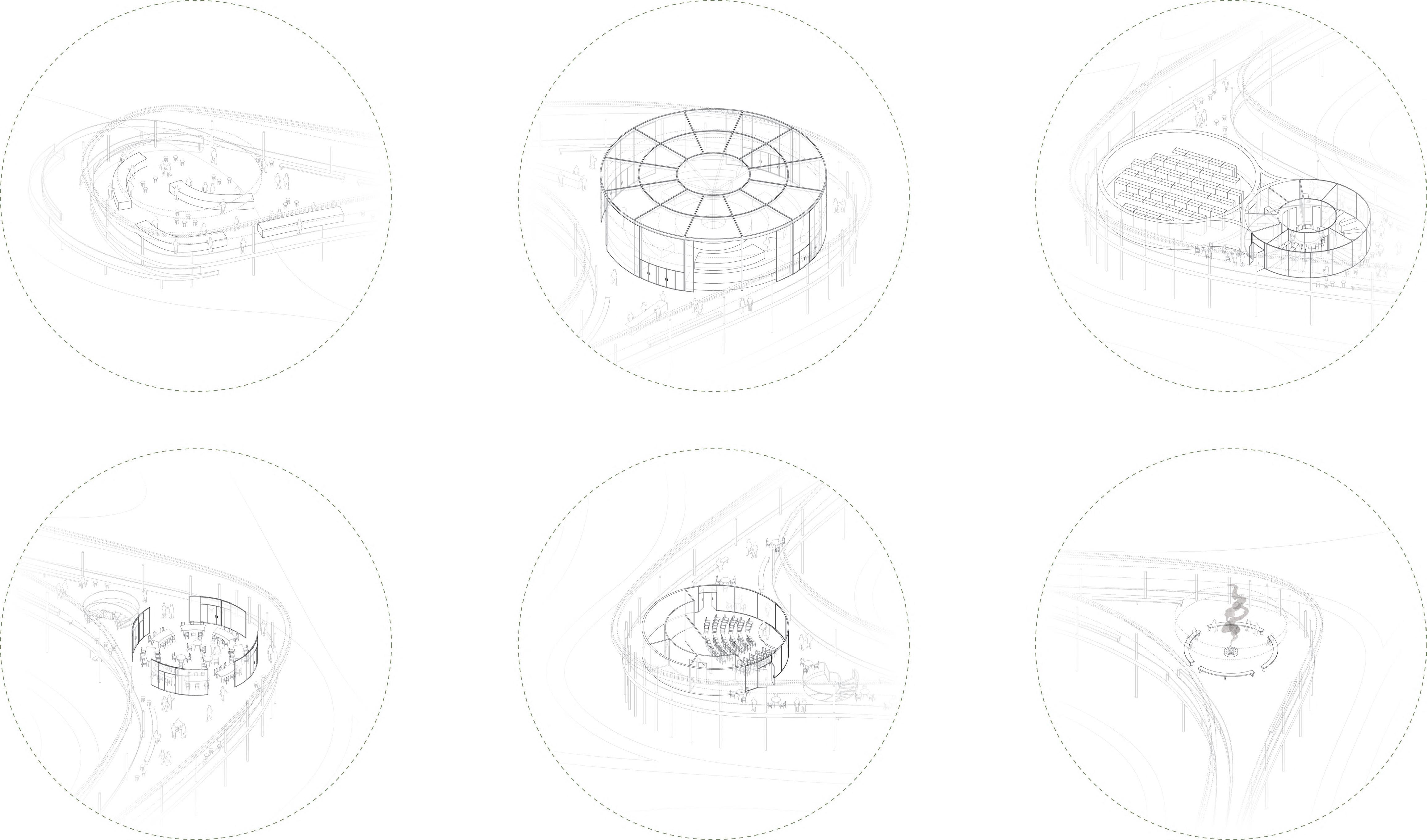 PROGRAMS: Each program features a the significance of the circle in Indigenous unity, strength, and the life cycle, the spaces for gathering, bonding, and learning programs are dispersed throughout the and are connected by a continuous roof