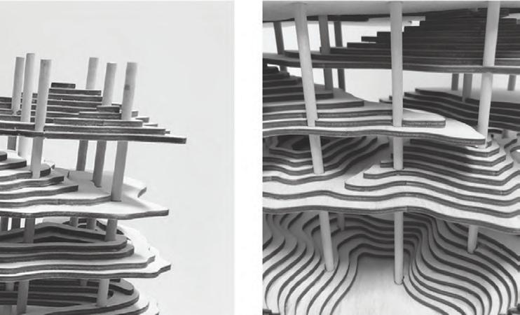 I further explored the theme of biomorphism by representing the contours of earth’s surface, also known as topography. For this project, we were asked to design a series of levels using only horizontal surfaces and links such as stairs and/or ramps. Each floor contains a different topographical form that is created through the stacking of plates which also act as stairs that link the next floor. Within each level, various social and physical activities are considered such as sitting areas and plateaus for gatherings. Since the structure requires heavy exercise, it would be most suitable as a playground for younger children.