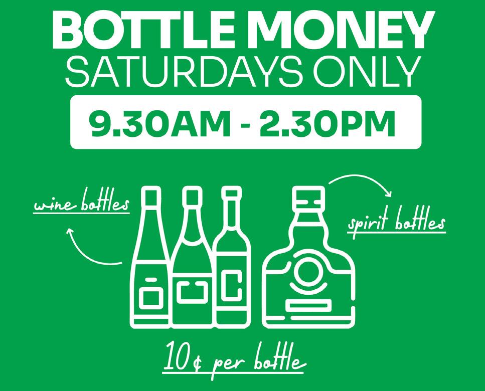 The Regional Waste Management Facility offers a 10c refund for glass wine and spirit bottles every Saturday between 9:30am to 2:30pm at the Rediscovery Centre.
