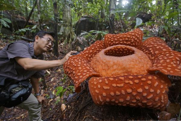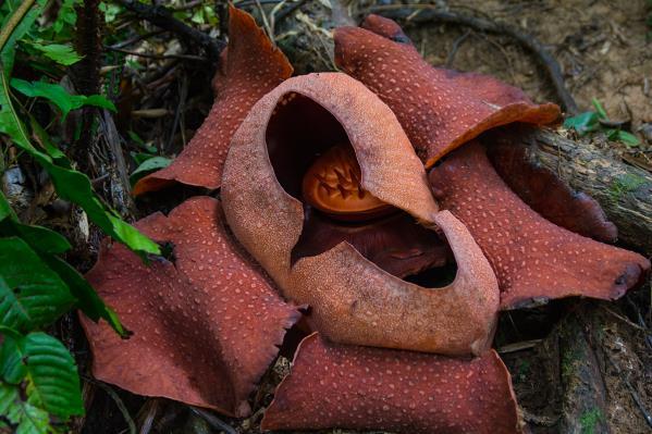 THIS PLANT PARASITIZES SHRUBS OF THE GENUS CISSUS RELATED TO VINES, AND DOES NOT PRODUCE ROOTS, STEMS OR LEAVES ITSELF. IT IS CHARACTERIZED BY THE FACT THAT IT HAS THE LARGEST FLOWER IN THE PLANT WORLD. IT CONSISTS OF FIVE RED AND FLESHY PETALS. ITS DIMENSIONS ARE 80–100 CM IN DIAMETER AND APPROXIMATELY 10 KG IN WEIGHT. IT EMITS A FOUL SMELL OF ROTTING CARRION, WHICH ATTRACTS FLIES THAT POLLINATE IT. IT BLOOMS FOR 5-7 DAYS ONCE EVERY FEW YEARS. DUE TO ITS ODOR, IT IS CALLED THE "CORPSE FLOWER" BY THE INHABITANTS OF SUMATRA.