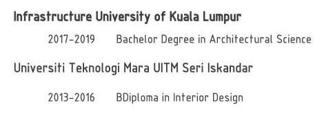 Motivated, Dedicated and Hard-Working person who is always curious and willing to learn more about Interior Design and Architect fields. Team playing is essential part of my play ground as I am always involved with them to bring their learning curve into the peak. As do I, always ambitious to be the master of the field. An Architect Designer and Interior Designer, expading my skills in Architecture Visualising, rendering and animation.