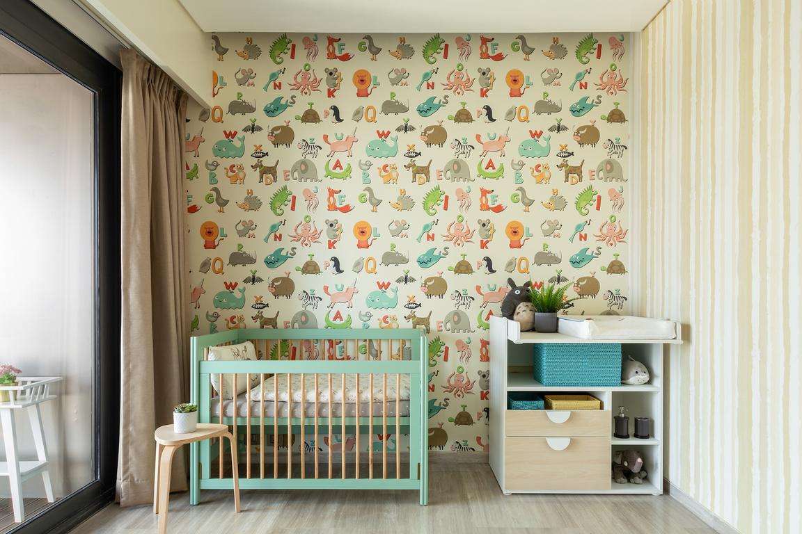 Illustrated wallpaper, a bright colored baby cot and cute little accents on the diaper changing station.