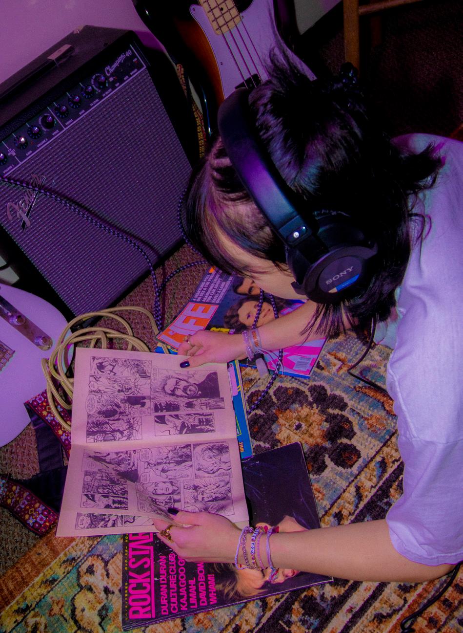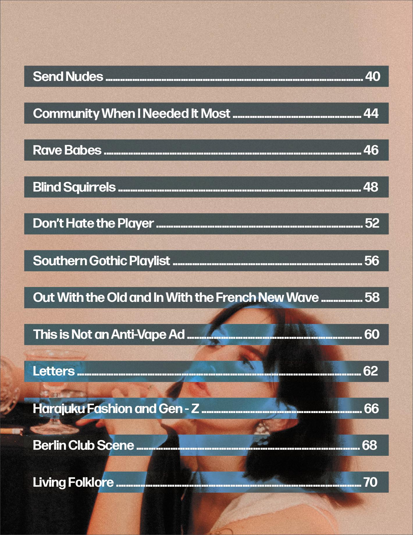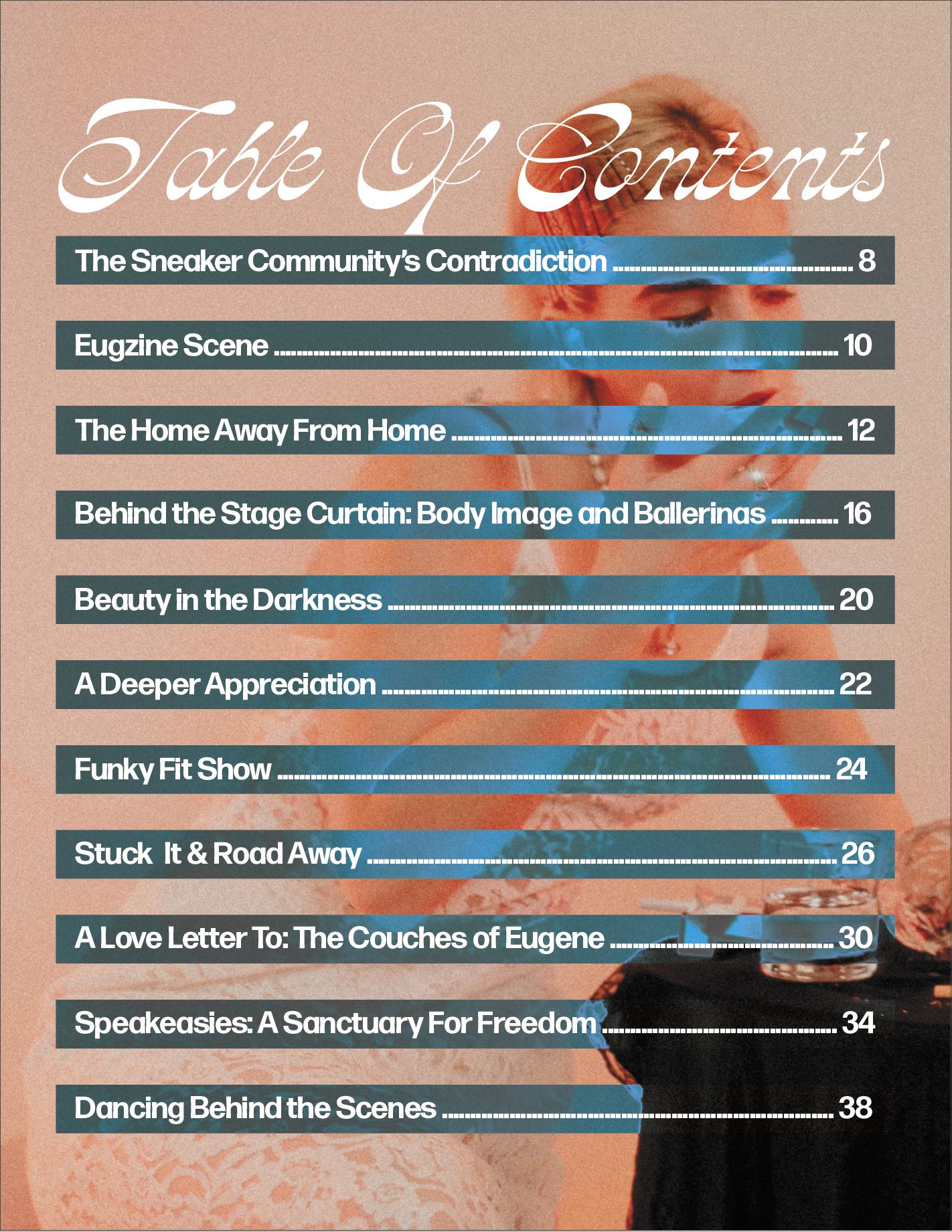 changes (check out their issue centered around Roe v. Wade), they make sure to highlight creativity and collective community. A majority of their spreads have a heavy emphasis on “music, arts, and culture,” Mahood says, such as a playlist in every spread, and articles on local artists and shops. Their creative content consists of photoshoots- shot by Finnin- collages, and art features done by a variety of artists who are all students at the University of Oregon. This variety of art mediums comes from “exploring as many different art forms as they can, which always comes with new ideas,” Finnin says. As a means of showcasing other art forms, they featured a tattoo artist and local nail artist in their latest issue, and have previously done a spread on a local florist.