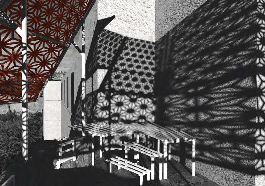 While the Pavilion case study was a static strucutre, this pavilion shows the beauty of kinetic shadows. The materials from the case study are repurposed to create this pavilion. The staircase leads to an outlook overlooking Segovia’s landscape and Alcazar. The structure works as one to create an interactive pavilion. As visitors walk up the stairs, panels above move with them. As they sit down, panels open letting a breeze in. Sgraffito is introduced reminiscing the architecture of Segovia. The pavilion changes a lookout point into an interactive experience. It reflects the culture of Segovia and developes the concepts of the case study.