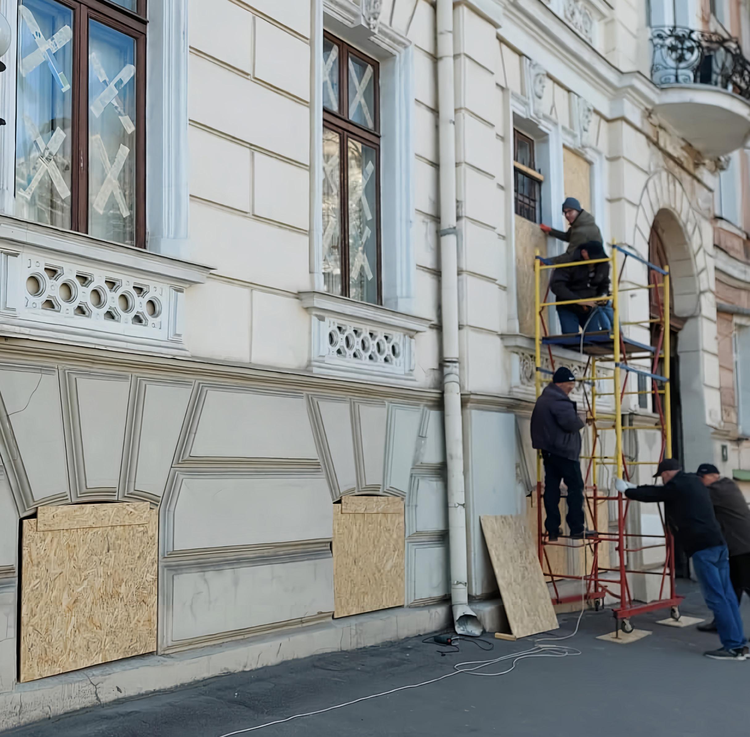 In July and August 2023, Odesa was heavily bombed. ALIPH quickly responded with a dedicated emergency fund to support the cultural institutions in the region. Within a day of the bombing campaign, the NGO Museum for Change had organized the installation of oriented strand boards (OSB) to cover the doors and windows of four museums. In addition, emergency stabilization works began at the Odesa House of Scientists as well as for two other significant monuments.