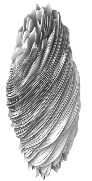 The design process here includes collecting data and inspirations from nature, and after the first sketches, designing an algorithm to produce the final result. To make this happen, Rhino is used for modeling the base geometry and used as the input of the algorithm in Grasshopper. Then by using the combination of Weaverbird’s Picture Frame and Catmull-Clark Subdivision multiple times, the details are added to the mesh before it is thickened and smoothed. Finally, the visualization phase takes place in Lumion. For this particular render(on the next spread), no post-production in photoshop was needed.