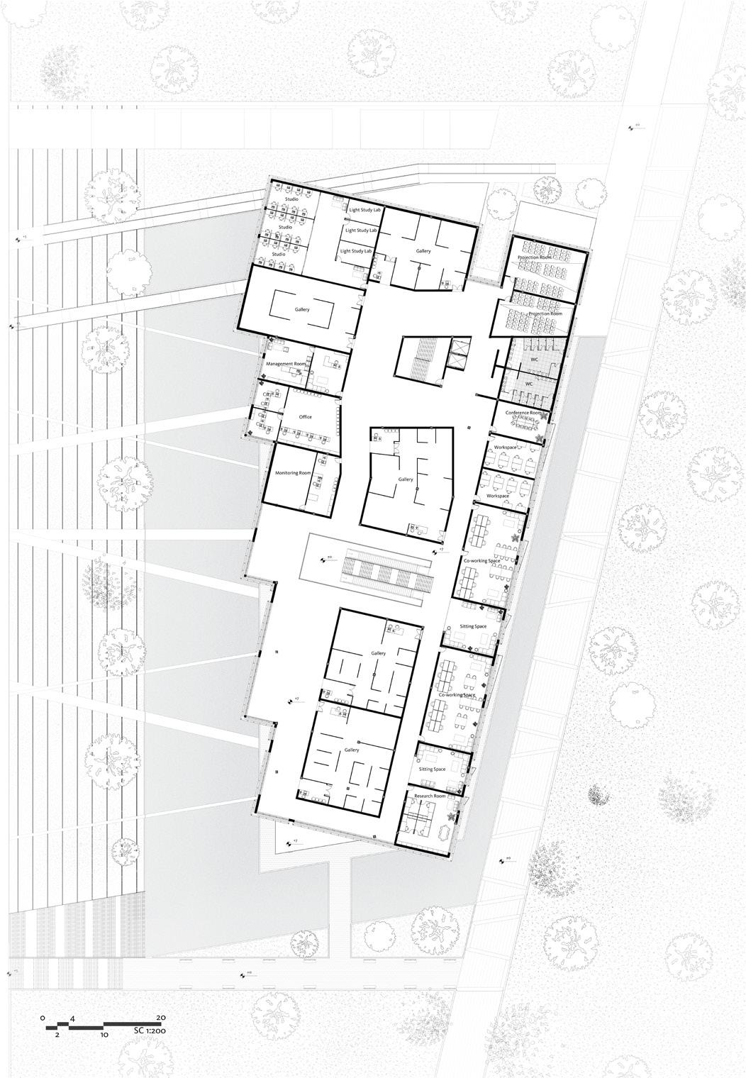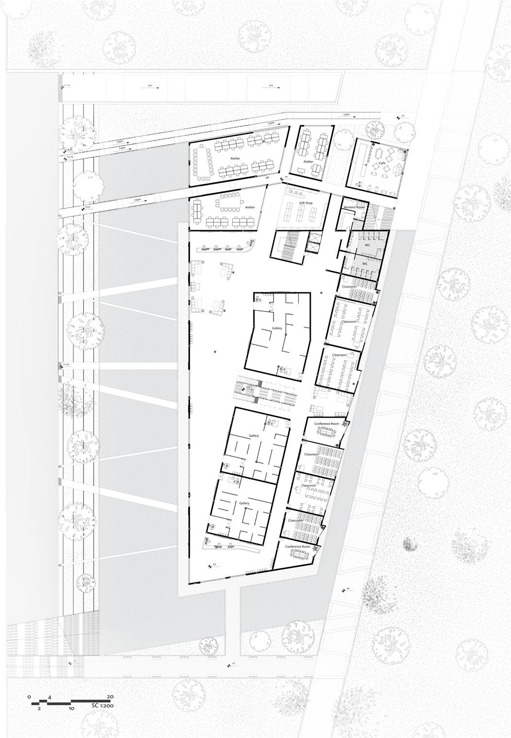 Art galleries, visual arts classrooms and studios, professional ateliers, and many other facilities such as a cafe, car parks, or a shop are the main features of this center in addition to many pedestrian and handicap shortcuts to the park from the street.