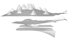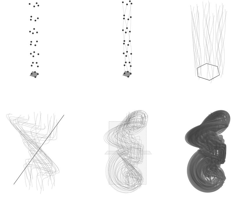 human where being had not evolved? The answers first seemed simple and needed more detailed questions to become more logical. Questions such as “What universe?”, “If humans had not evolved, then what creature did?”, “What would be the context of that architecture?”, “What needs do those creatures have?”, “How did the evolution affect that architecture?” and many others, in addition to a number of mental images of parallel universes and imaginary creatures, resulted in the following images. (Note: The images on page 30 is not related to either of the two projects that are mentioned above and are the results of an algorithm in Grasshopper that makes a continuous line around any mass and moves its points toward its normal vectors to make random 2D images.)