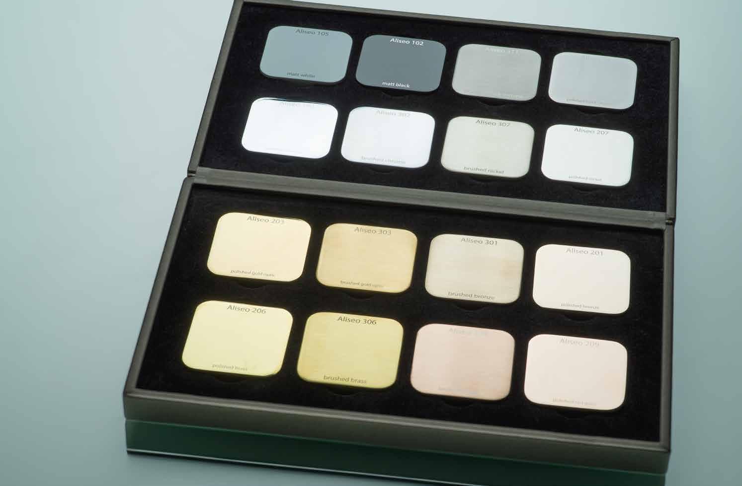 There are no limits to creativity. Almost any color can be implemented using the PVD process, making any vision a reality. And it‘s very simple: a sample is all we need to determine the color. However, the manufacturer‘s color code, which the ALISEO product should match, is often sufficient.