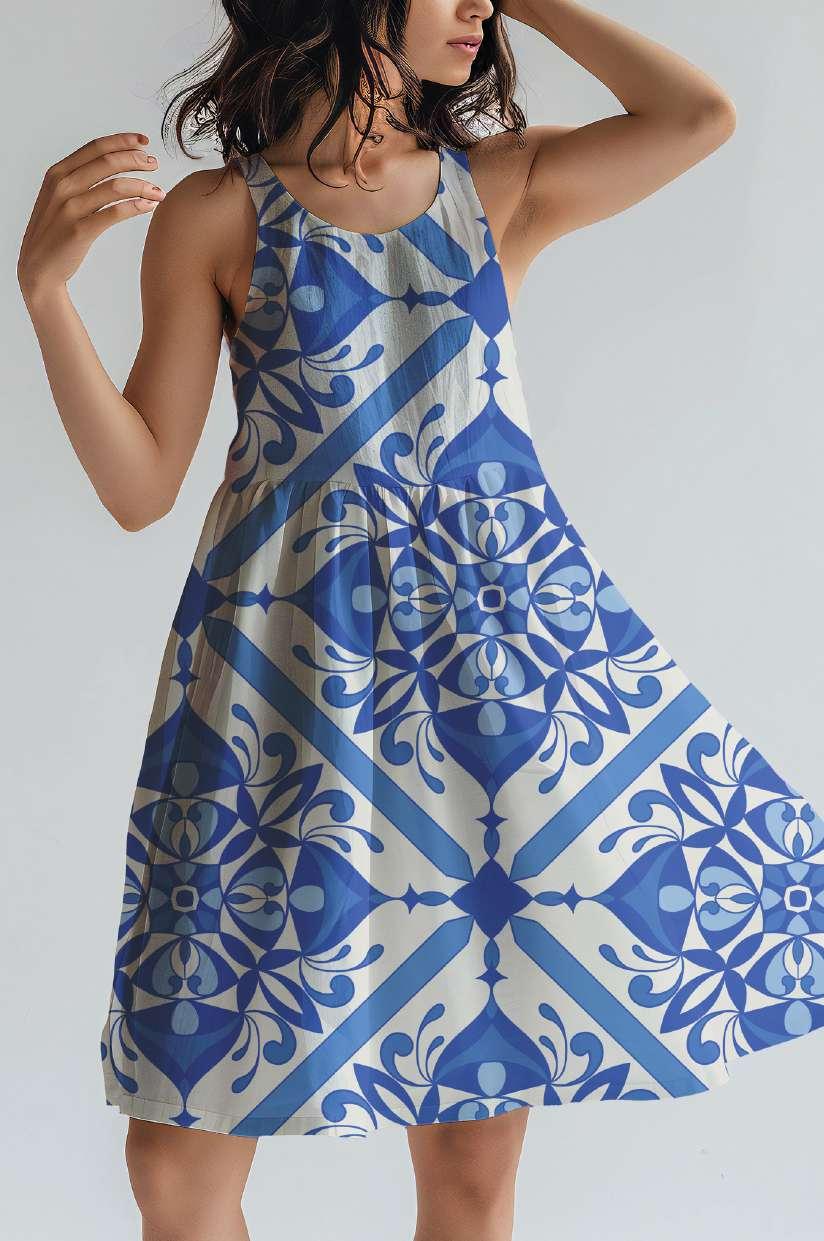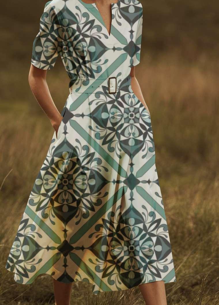 A modern twist on classic geometric patterns. Featuring a captivating arrangement of intricate tile motifs, this design adds a bold and stylish statement to any garment. Perfect for those seeking a distinctive and fashionable look, the print seamlessly blends sophistication with contemporary flair, making it a standout choice for a chic, eye-catching wardrobe.