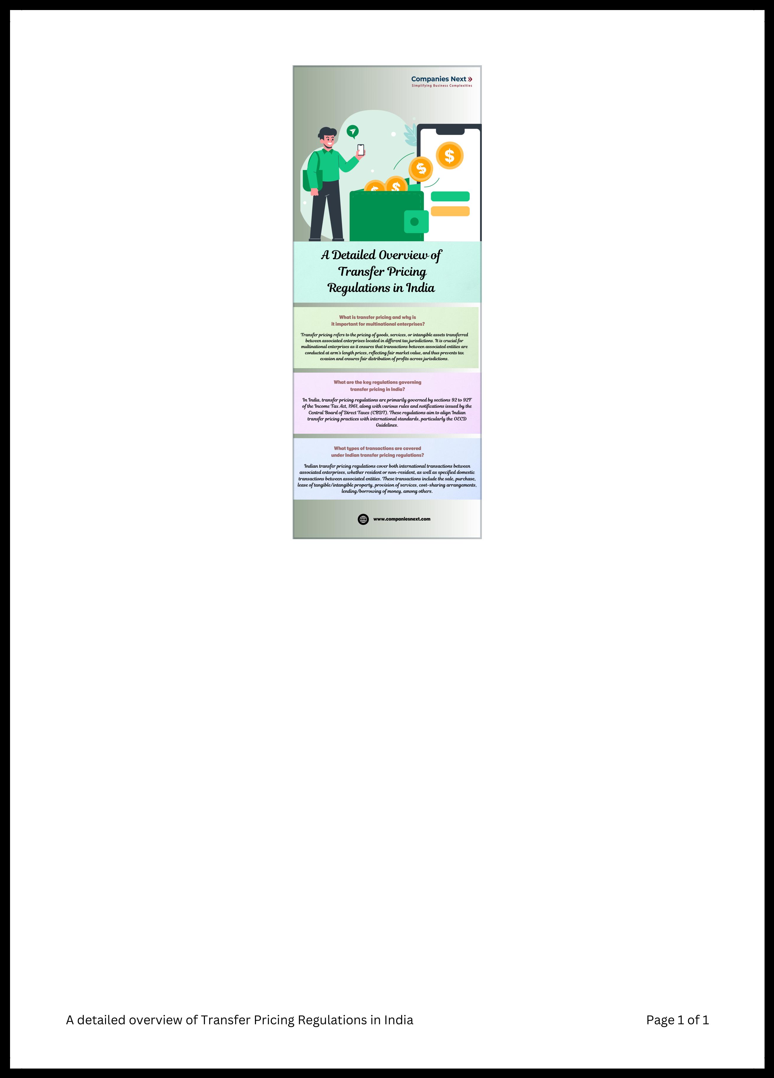 Transfer pricing regulations in India ensure fair pricing in transactions between associated enterprises to prevent tax evasion. Documentation, reporting, and penalties are key aspects, aligned with OECD guidelines. Non-compliance incurs penalties and loss of tax benefits.Also read- https://www.companiesnext.com/blog/a-detailed-overview-of-transfer-pricing-regulations-in-india