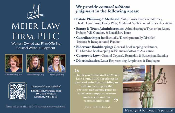 www.herzoglaw.com • 518.465.7581 Protecting What You Value Most •Estate Planning •Long Term Care Planning •Business Succession Planning •Special Needs Trusts / Guardianships •Estate Administration •Estate Litigation As a full-service Estate Planning and Elder Law firm, we pride ourselves on being able to walk you and your family through all stages of Estate Planning, Medicaid Planning, Estate Administration and Tax Planning. Webinars available at herzoglaw.com ALBANY SARATOGA KINGSTON CLIFTON PARK 7 Southwoods Boulevard 47 West Harrison Street 130 N. Front Street 855 Route 146, Suite 220