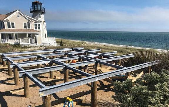 One outstanding example of this is a home she designed for a seven-acre site in Chapoquoit. The property is largely in conservation and originally had a home sitting right on a dune in a high velocity zone. Her clients had a choice: Accept the house as it was or tear it down and build to meet the newer floodplain regulations. They chose the latter, and the engineering involved to make it permittable included driving ninety piles forty feet into the ground and connecting them through a foundational network with steel columns coming up to the house.