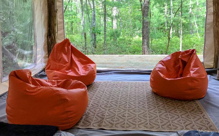 Some of her outdoor rooms are standalones, like the glamp—or glamorous camp—structure (left) she built for a Cataumet property (above). They are also marvelous for children, like the three sons of her Cataumet clients, who often use their glamp as a hideaway for playing games and reading on these beanbag chairs (bottom left).
