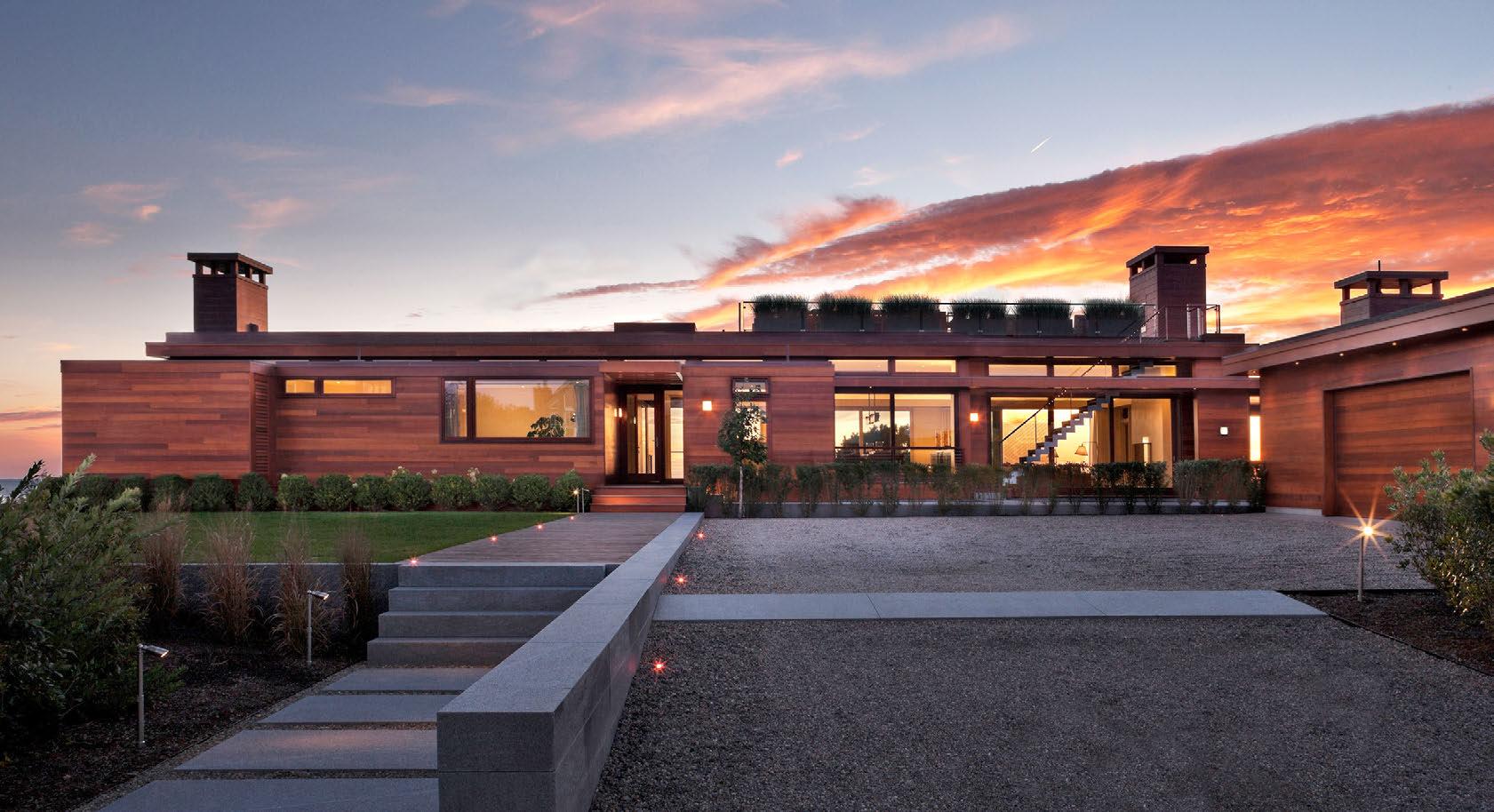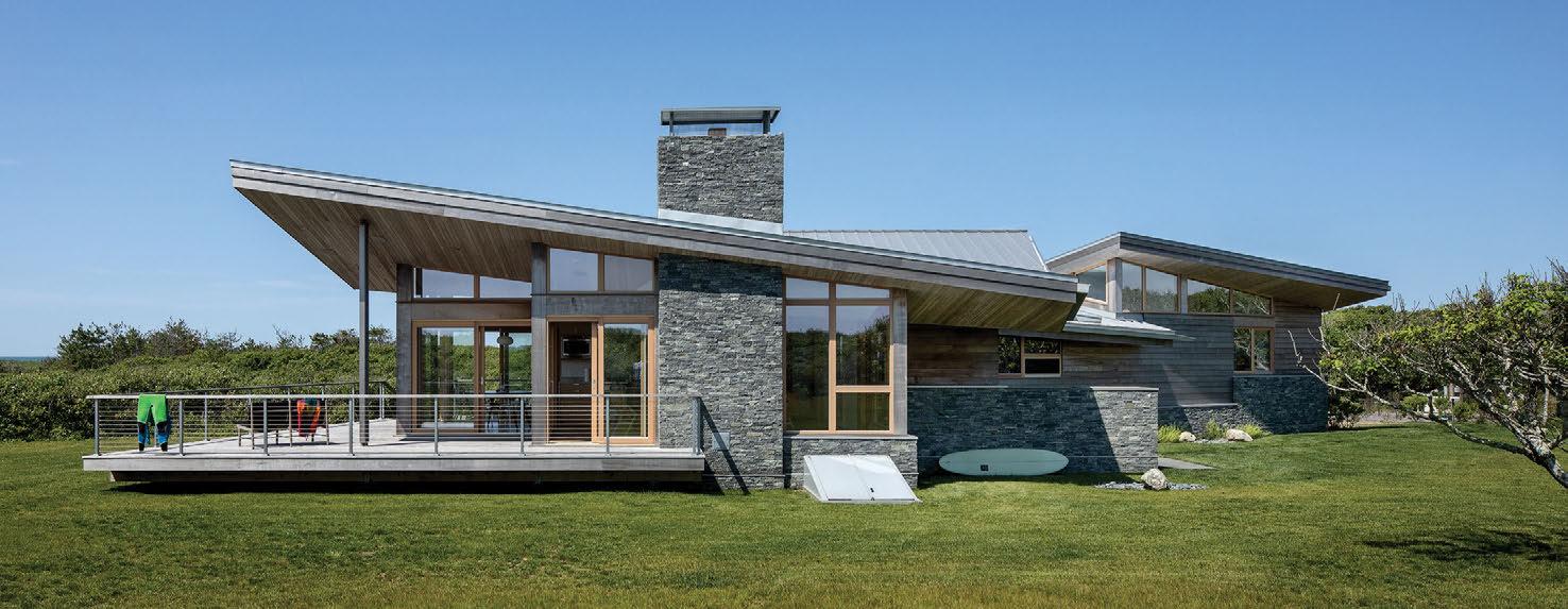 public is now recognizing the precedent for this type of architecture. In that spirit, Neubauer designed a modern Truro beach house that settles into its landscape. Built to step down the hill so as not to obstruct the neighbors’ view and built with a flat roof to adhere to a height restriction, the home, like others she has designed, engages in a dialogue of glass, or what she describes as “a quiet relation of matching glass from one side of the house to the other, a one-to- one match of beautiful transparency,” she says. “The house that taught me that is a historic house owned by Katharine Cornell on Lake Tashmoo on Martha’s Vineyard. It has a gorgeous old living room with matching glass on each side. I saw it years ago and never forgot it.”