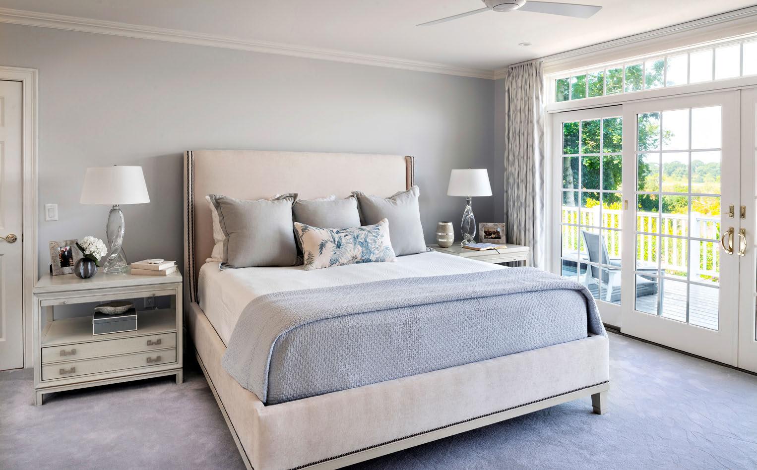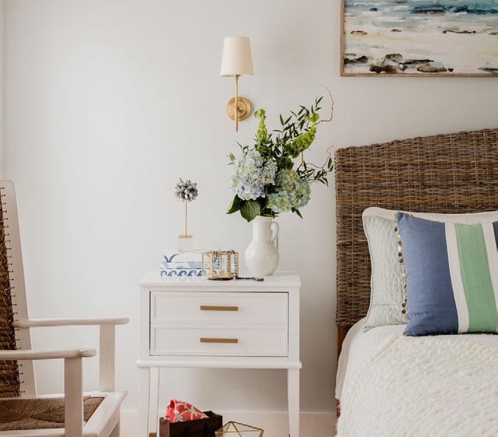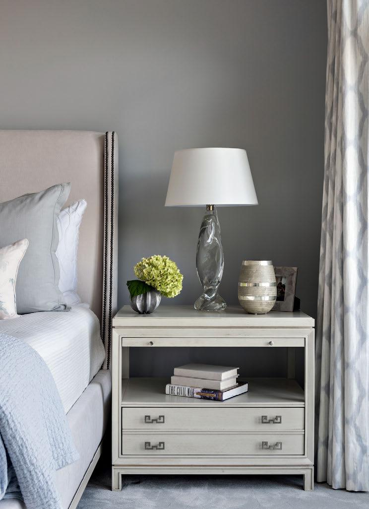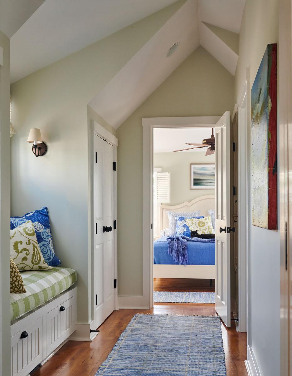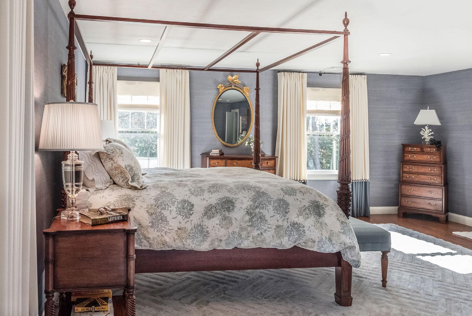 The afternoon light permeates the master bedroom that was designed to create a sense of comfort and warmth. The bright floral drapes and natural greens depicted in the window seat enclave (opposite page, above left) bring the elements of the outdoors in.