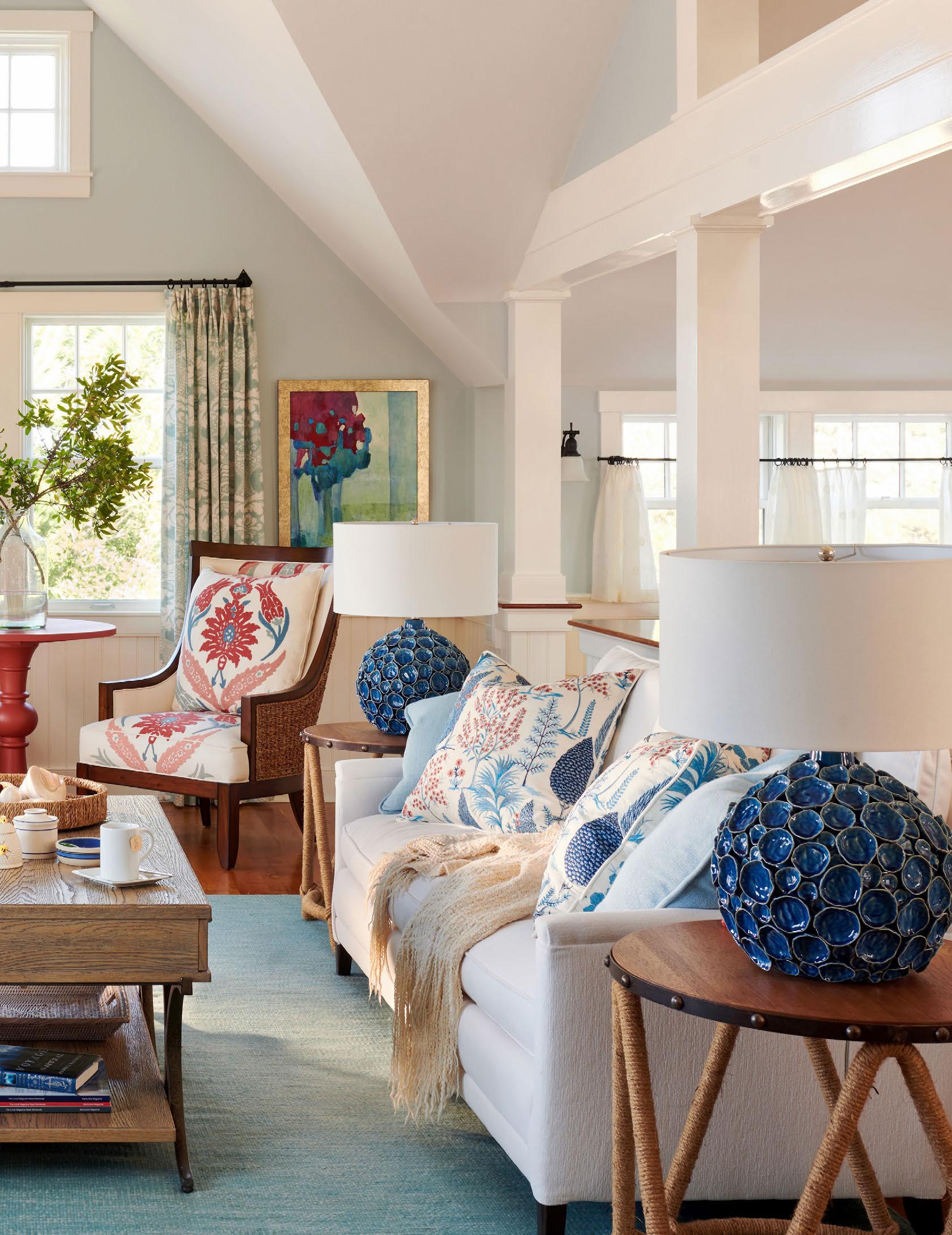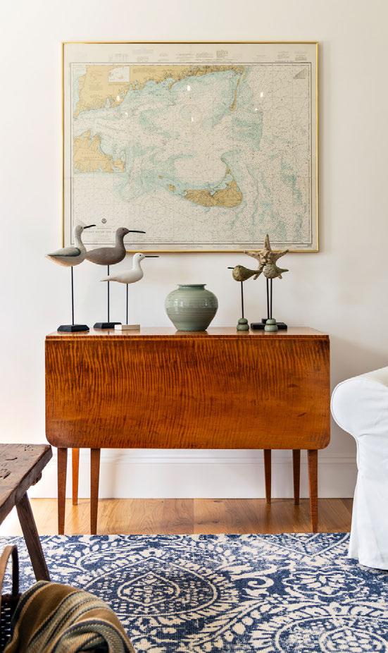 Carved wooden shore birds and nautical maps give a feeling of the beach while not being “kitschy” and they balance well with a rug with a bold blue pattern.