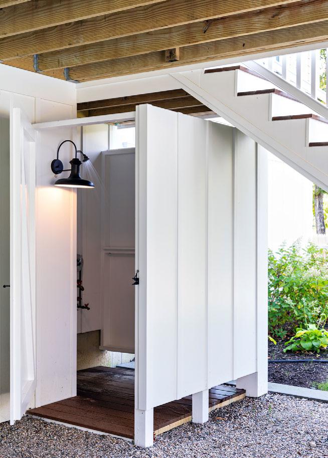(Above) The Greek Revival is in its full glory from this vantage point. (Below) An outdoor shower is tucked purposefully under the deck.