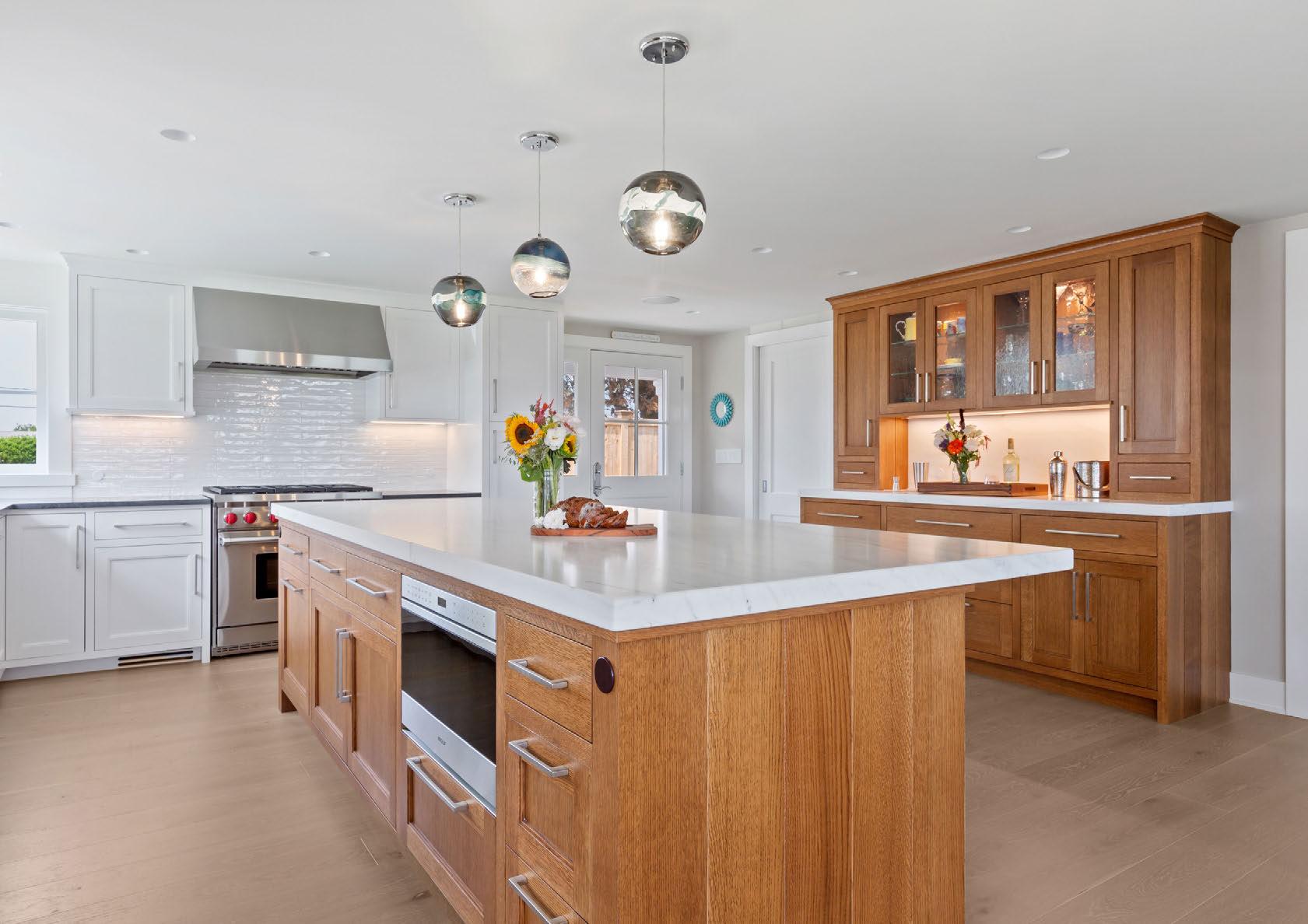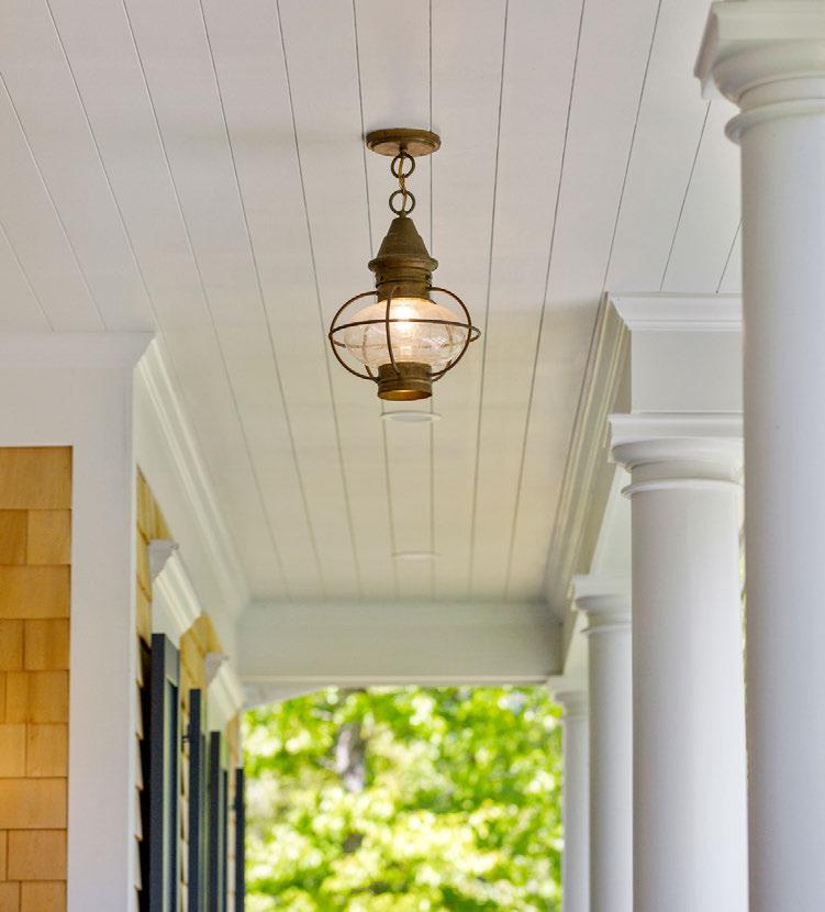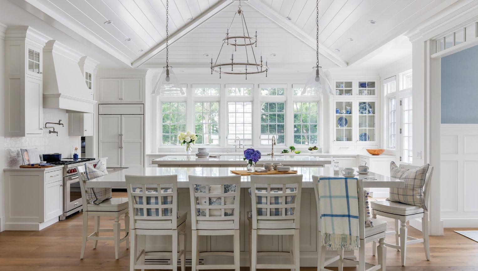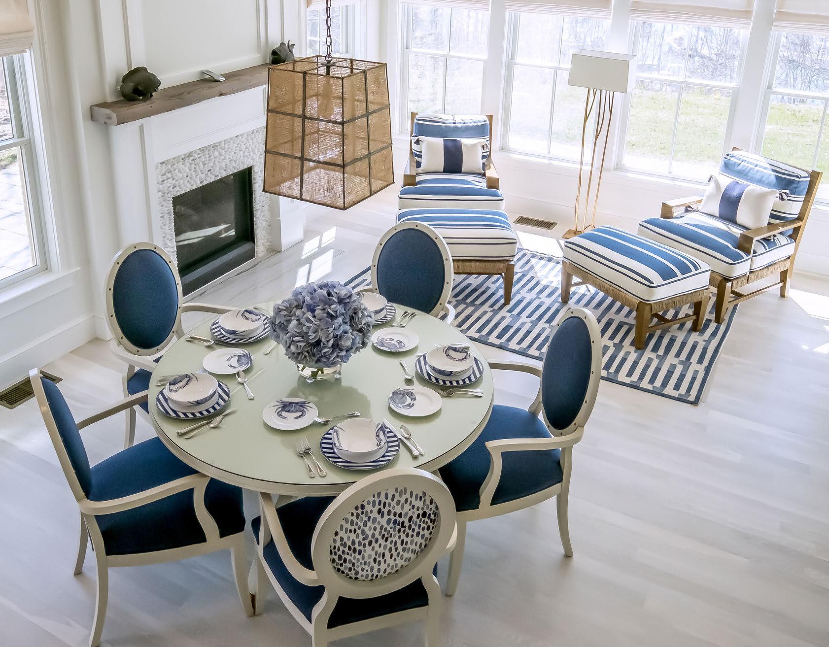 As will be noted in the kitchen, we installed outdoor Bermuda shutters indoors. This feature not only provides shade from the hot summer sun but also adds a custom casual vibe to this space. The navy-and-white palette continues in the kitchen with the directors’ chairs as well as the pendant lights. The pendants are actually ceramic and were designed to look like buoys.