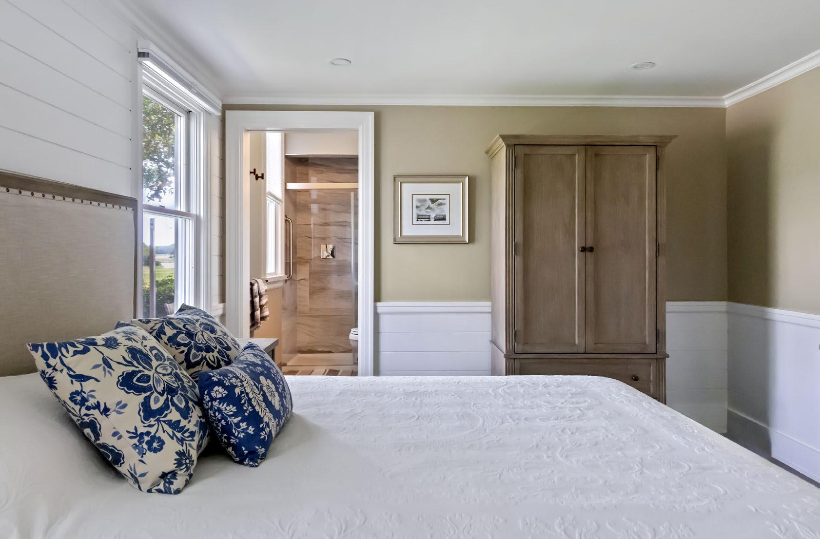 In the third-floor primary bedroom, the view from the Juliet balcony is stunning. There are two directors’ chairs outside on the balcony and two comfortable chairs flanking the floor-to-ceiling windows.