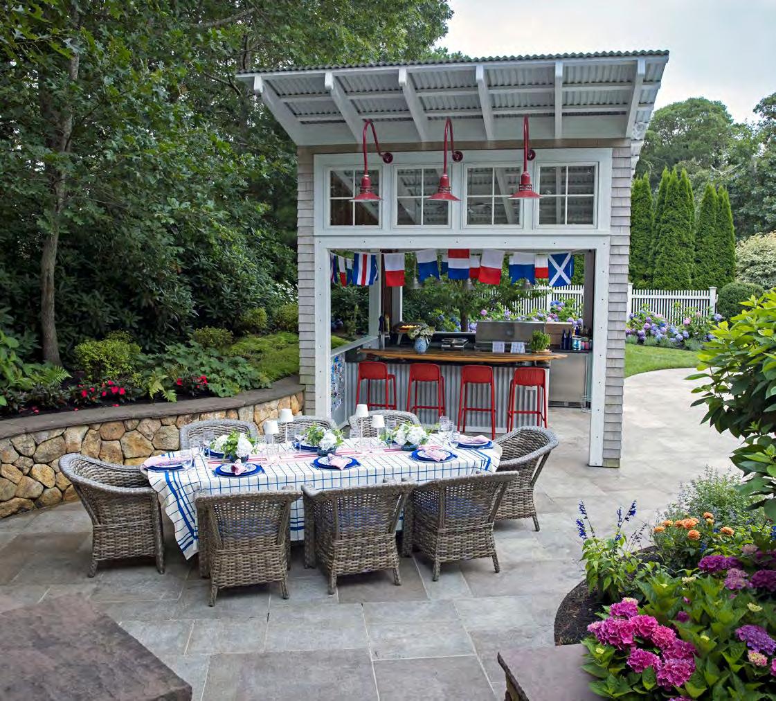 Gorgeous landscaping and a beautifully designed outdoor kitchen transform this backyard into a charming alfresco pizzeria.