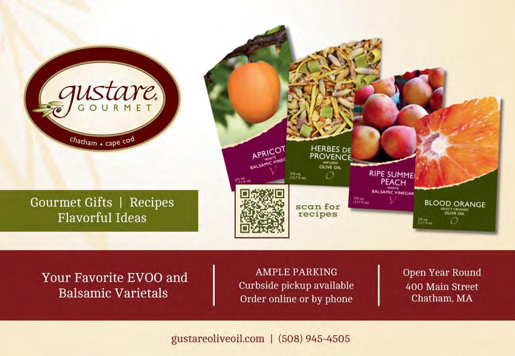 GUSTARE GOURMET On Main Street since 2009, this popular shopping experience offers the highest quality artisanal extra virgin olive oils, balsamic vinegars, gourmet pantry and gift items. In Italian, Gustare means “to taste, to enjoy, to savour,” so join them and discover your favorite flavorful selections. Ample parking for shopping and pick up. 400 Main St., 508-945-4505, gustareoliveoil. com GOURMET FOOD