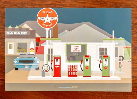 has long admired classic car advertising and signage and is known for his posters featuring the vintage racing cars that distinguished the Le Mans and Daytona racetracks in the 1960s and 1970s.