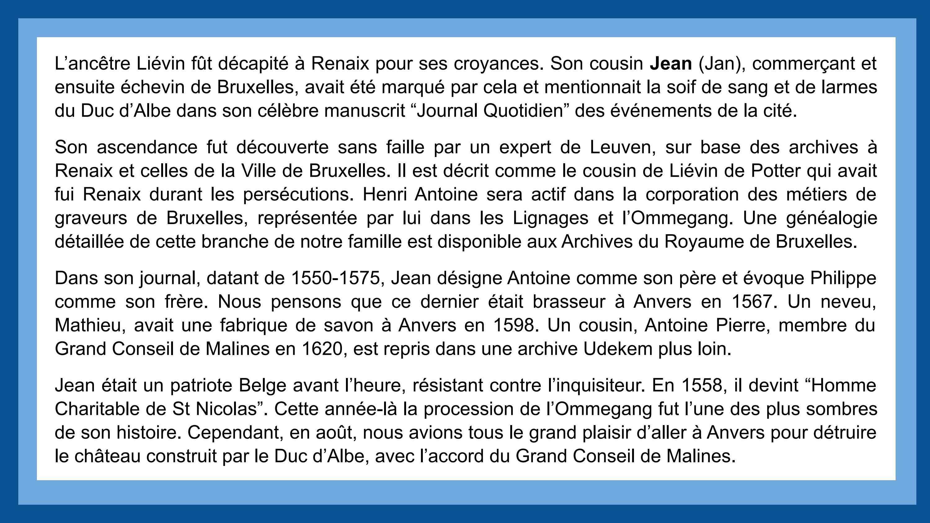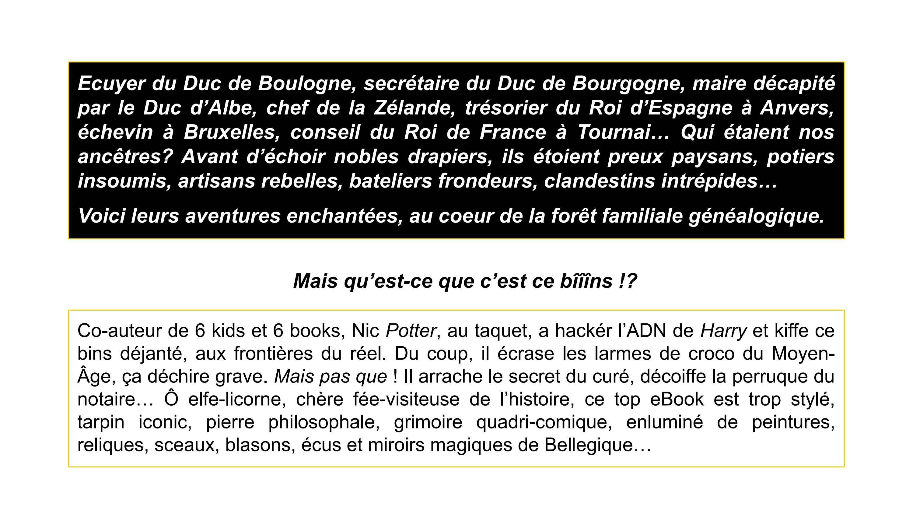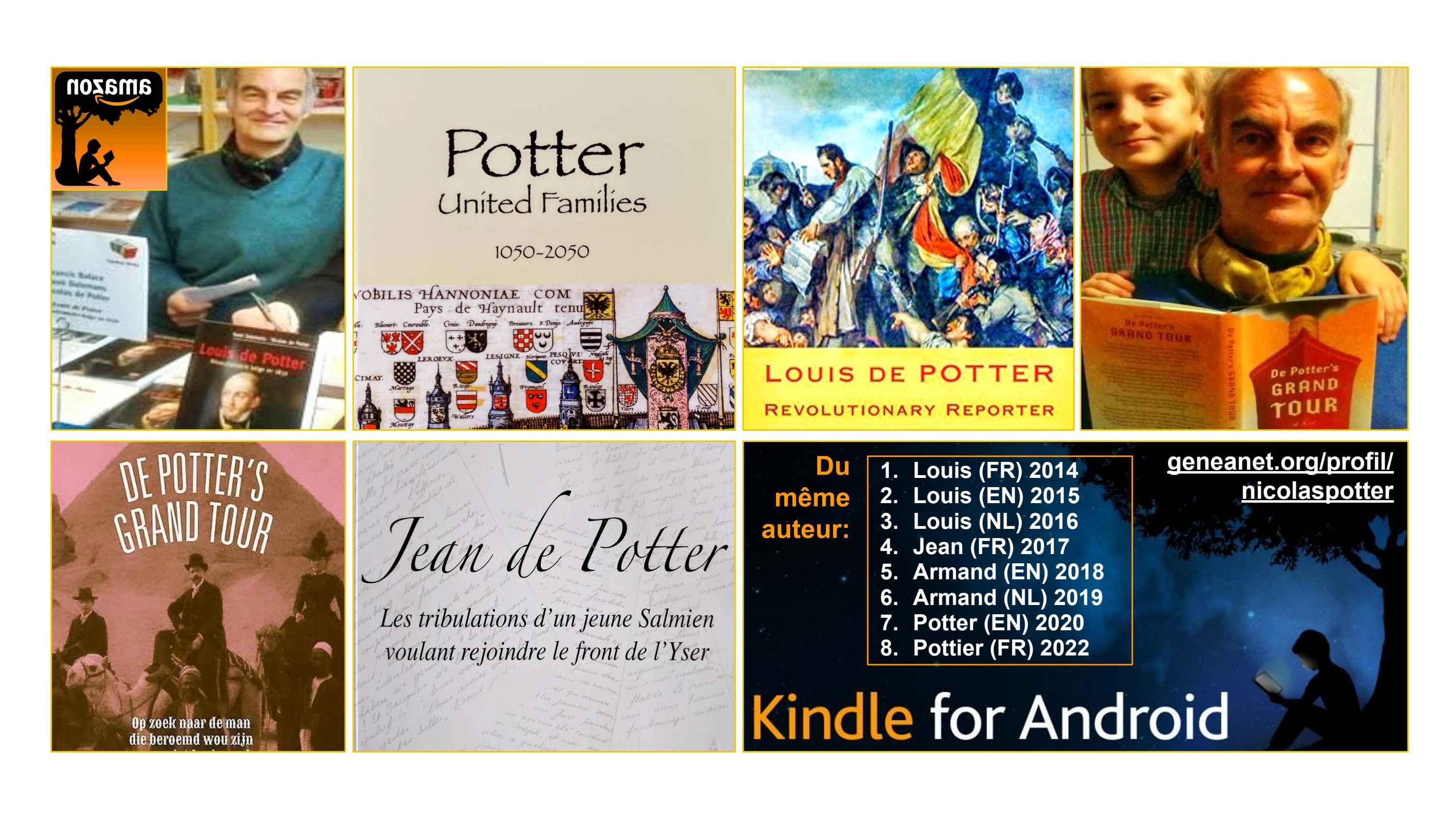 Nic is co-author of six great kids in Brussels and six beautiful books in Bruges. With volunteers networks, his intelligence agency investigated the Potter families twenty years. The Potter Millenium Mysteries, uncovered - century after century -. 1100: Graal quest of King Godfrey (Ardennes) 1200: Heroïc celtic craftsmen (France, UK) 1300: Textile heretic rebels (Flanders, UK) 1400: Brilliant Flanders scouts (Bruges) 1500: Rebels to bloody Duke Alba (Brabant) 1600: Secret great sickness agent (Holland) 1700: Brave revolution leader (Brussels) 1800: Forgotten migrants (Italy, America) 1900: WW1 hero escape (Germany) 2000: No men's Land (Belgium)... 2020: Amazing true illustrated adventures. 2050: Join the Book-Chain!
