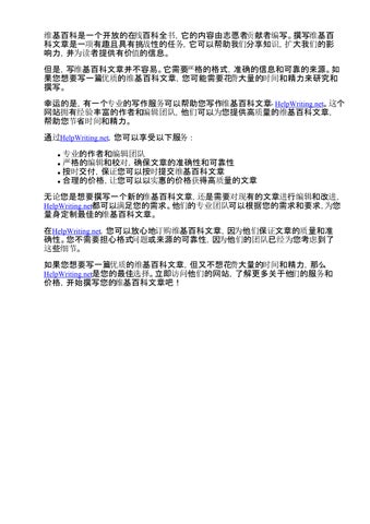 如果您想要写一篇优质的维基百科文章,但又不想花费大量的时间和精力,那么 HelpWriting.net是您的最佳选择。立即访问他们的网站,了解更多关于他们的服务和 价格,开始撰写您的维基百科文章吧!