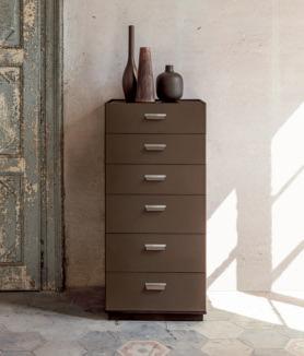 Chest of drawers and bedside table in glossy or matt lacquered MDF. Chrome plated or painted steel base. Metal handles.