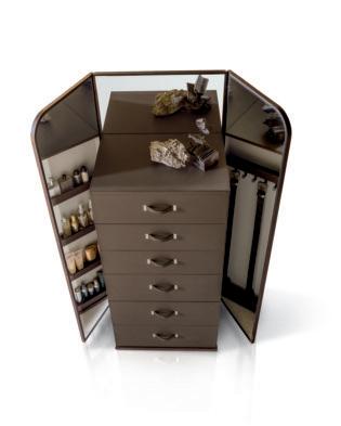 Chest of drawers, hight chest of drawers and bedside table in heattreated oak or in Italian walnut covered in hide with decorative stitching. Top in hide or in marble. High chest of drawers also equipped with mirror and make up accessories. Top in hide (art. SKN2A).
