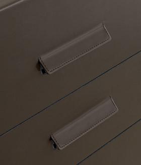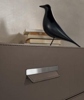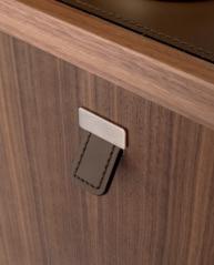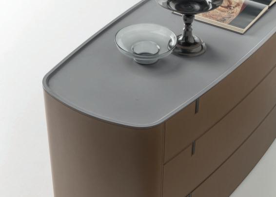 Comò, settimanale e comodino in rovere termotrattato o in MDF laccato opaco. Top in pietra acrilica rivestito in pelle. Maniglie in pelle.
