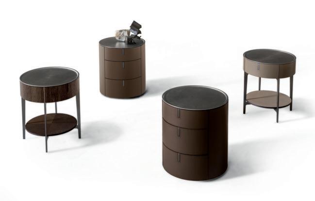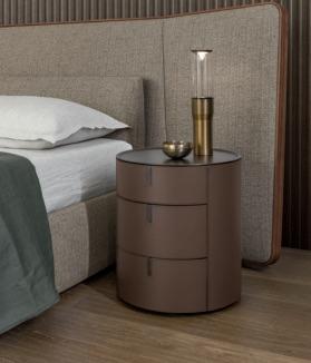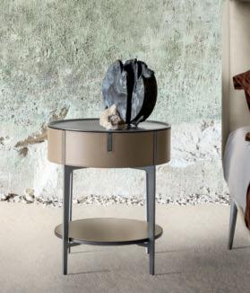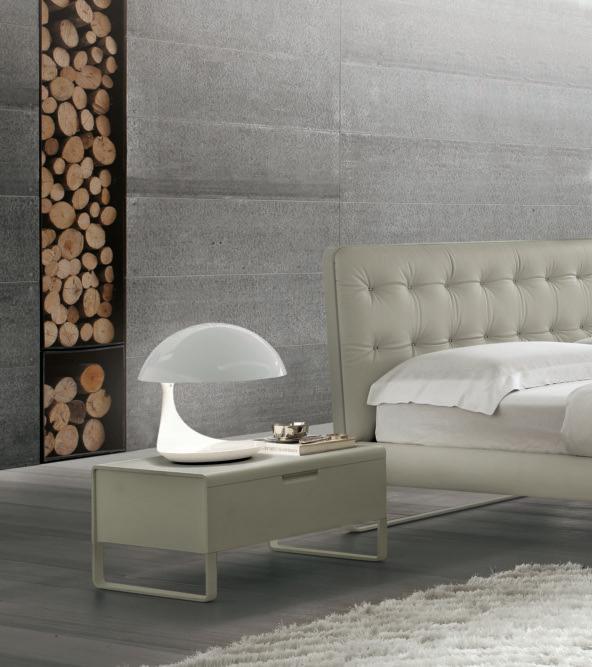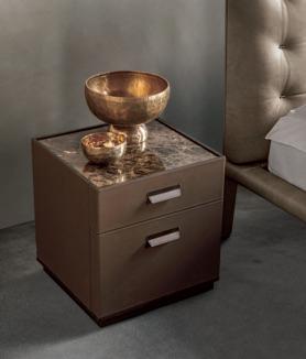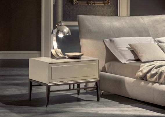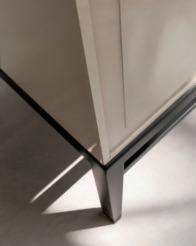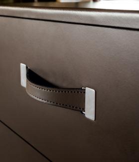 Comodino e cassettone con struttura in MDF laccato. Cassetti con guide metalliche frenanti e frontale laccato. Maniglie in pelle. Base in fusione di alluminio verniciato o brillantato.
