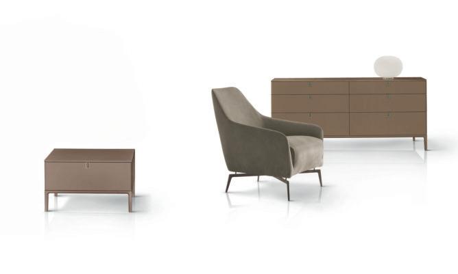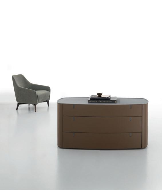 Serie di complementi laccati composta da comò e comodino. L’eleganza è valorizzata dalla forma della maniglia che garantisce continuità estetica e dalla snellezza dei piedini in fusione di alluminio verniciato o brillantato.