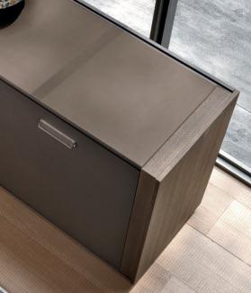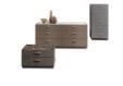 Cassettone e comodino compongono la gamma dei complementi notte Esprit, contraddistinti dal top con spigolo frontale smussato e dalle maniglie incassate.