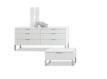 Cassettone e comodino in MDF laccato lucido o opaco. Base in acciaio cromato o laccato. Maniglie in metallo.