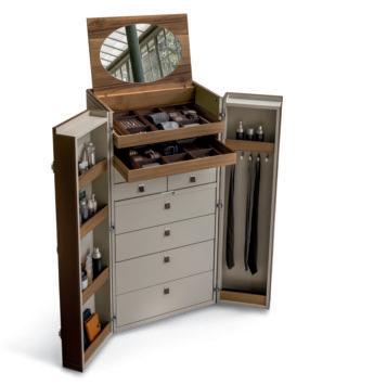 Chest/Trunk. Frame in italian walnut. Linen matt lacquered inner frame. External cover, handles, 2 upper drawers and pull out shelf covered in hide available in the following colours: sand C17, natural C16, mud C28, moka C11, black C09 and bulgarian red C05. Equipped with lift-up mirror for make up, hooks to hang belts and side storage compartments. Tray set on demand composed by: dresser valet, ring holder and watch holder. Closing clip in satin nickel.