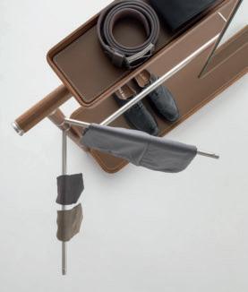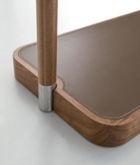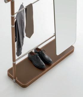 Servomuto. Struttura in tubolare di alluminio impiallacciato noce canaletto. Barre porta abiti in acciaio satinato. Accessoriato con vaschetta portaoggetti in massello di noce con inserto in cuoio caffè C32, specchio inclinabile e regolabile con gancio appendiabiti in acciaio satinato. Base in massello di noce con inserto in marmo o in cuoio caffè C32 con cucitura decorativa.