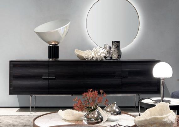 La riscoperta delle arti decorative provenienti dall’Oriente dona agli arredi un originale effetto laccato lucido brillante. I riflessi delle superfici sono l’atout di una collezione che esplora la materia per portare alla luce la sua raffinatezza nascosta.