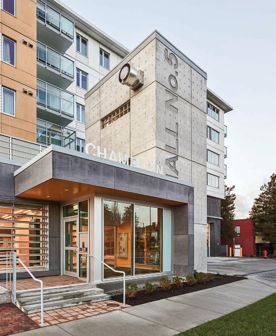 While the project was originally conceived as a modular building, it was executed using conventional construction technologies. “The early explorations of modular did contribute to a very efficient and disciplined design which benefitted its execution using conventional means,” says Kunzle. “We also maintained the main mechanical and electrical distribution concept that was designed for the modular option with dedicated vertical shafts in the resident home areas.