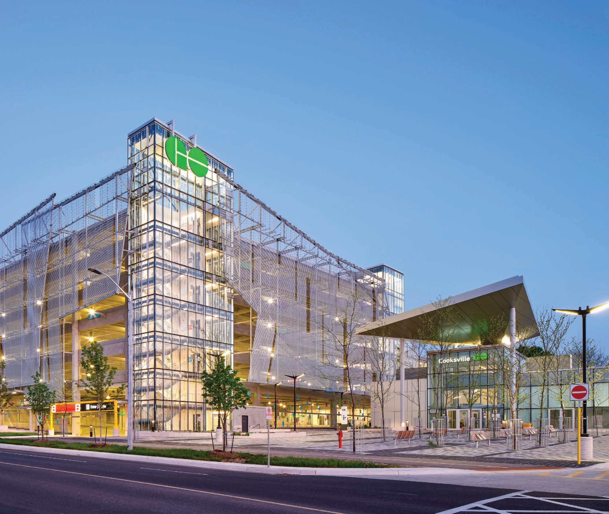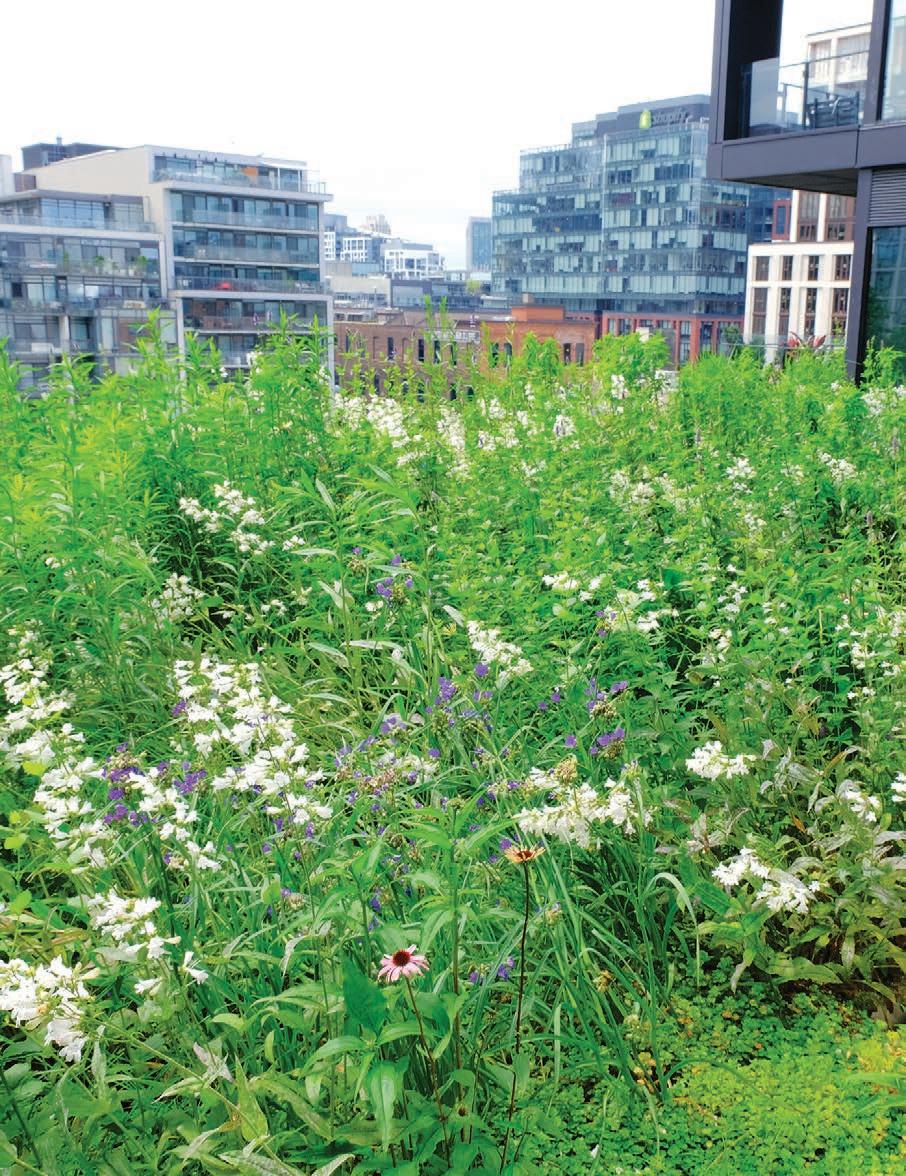 Carol Phillips, partner at Moriyama Teshima, notes that the architecture was driven by the goal to promote health and wellness at every level: natural daylighting was maximized thanks to generous structural bays; both through passive natural convection and building automation systems, fresh air would move through the building; large overhangs would reduce solar heat gain and control glare; and geothermal heating, a rainwater harvesting system for toilet flushing and irrigation, green roof, rooftop solar PV panels, and automated daylight dimming controls further contributed to significant energy savings.