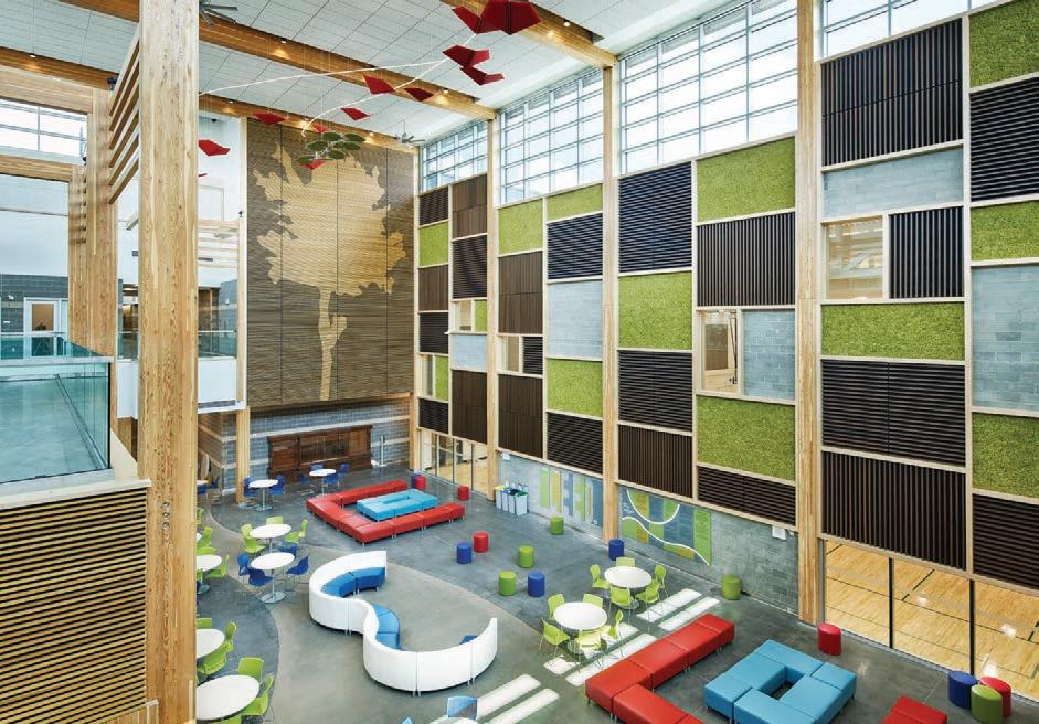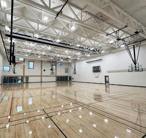 Environmental sustainability is another cornerstone of Biigtigong Nishnaabeg’s vision for its new elementary school. The facility was designed with energy efficiency in mind, utilizing cutting-edge technologies and sustainable materials to minimize its ecological footprint. A timber frame design and extensive wood products form the structure; there’s also a high-efficiency HVAC system, including a concrete slabon-grade with an in-floor hydronic heating system.
