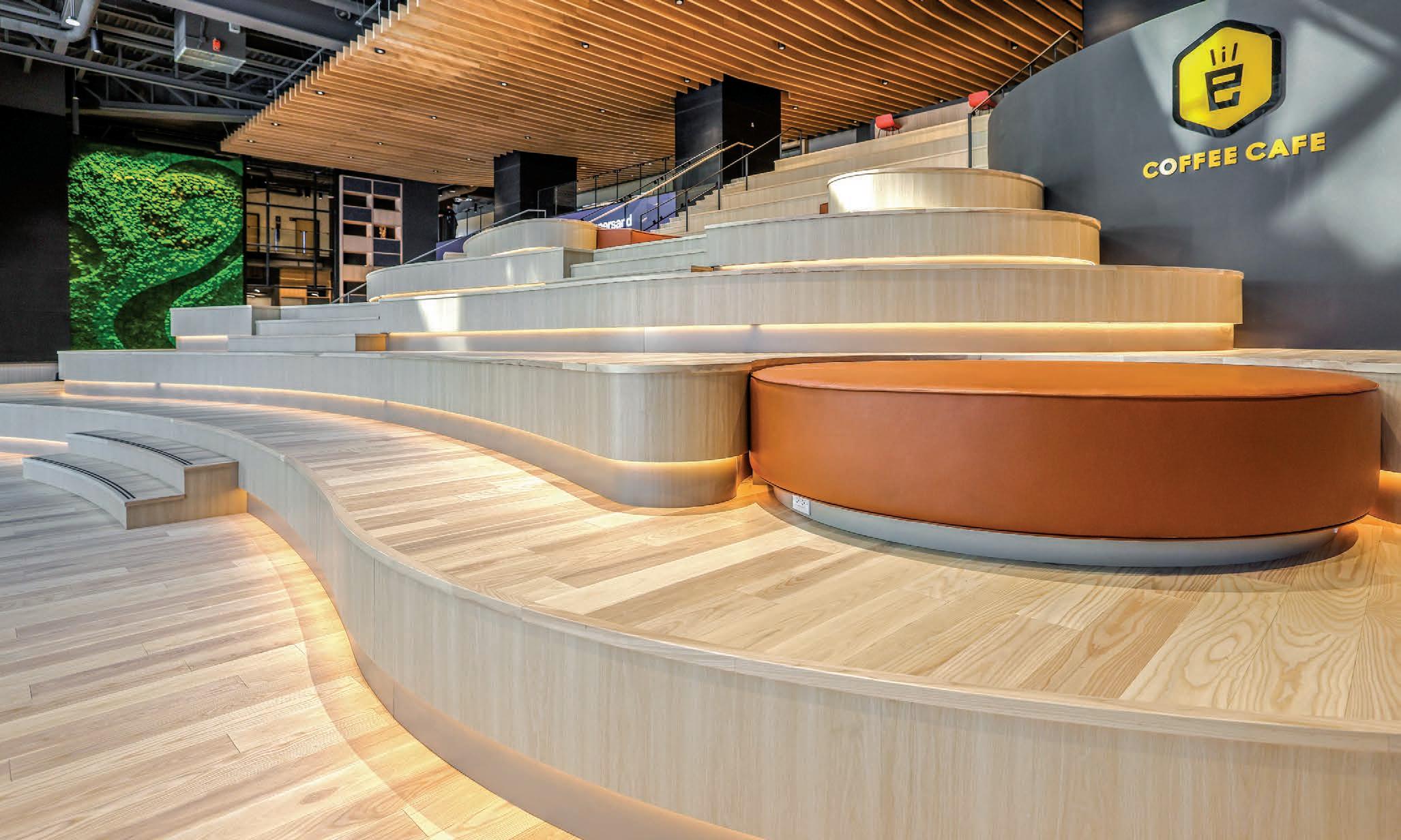 also designed shareable spaces on the main floor, including the lobby, café, and main floor terrace, as well as a multipurpose, convertible event area.
