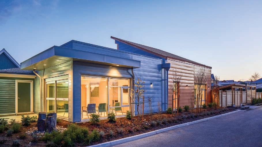 grain metal panels for the exterior exudes a sense of residential comfort and natural beauty. This theme extends to the interior, where the flooring materials and resident-accessible doors incorporate nature-inspired patterns and colours. The result is a welcoming and soothing environment that stands in stark contrast to the institutional feel often associated with long-term care facilities.