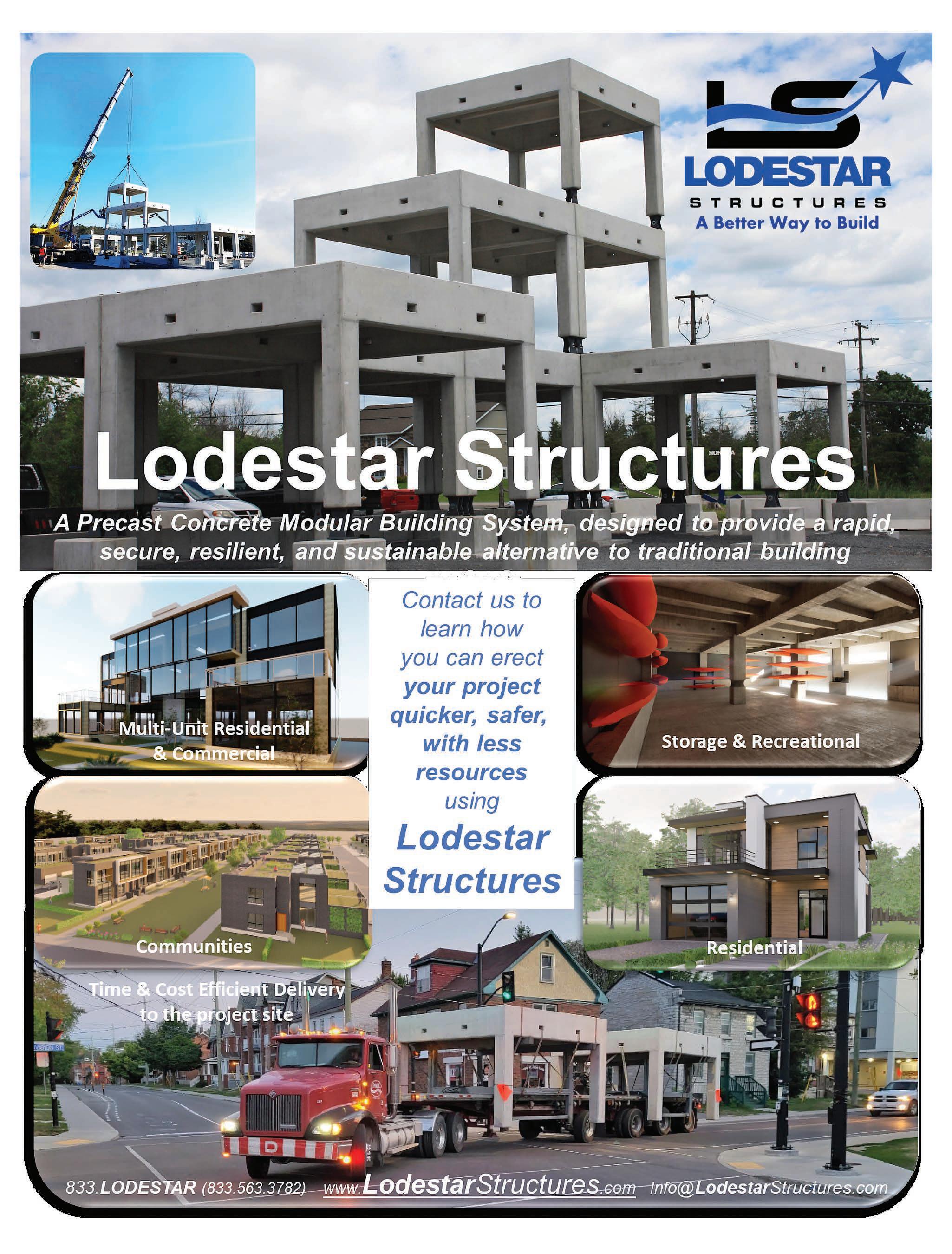 Darrell Searles, president of the Lodestar division, says, “By licensing precast concrete or ready-mix plants near areas where Lodestar structures are required, we supply the moulds and technology required to make structures to build, or re-build entire communities. Each Lodestar structure provides up to a 436-square-foot building footprint consisting of commercial rated support columns and integrated surface slab, and when connected horizontally or vertically they expand the footprint to accommodate up to seven storeys tall and unlimited width and length.”