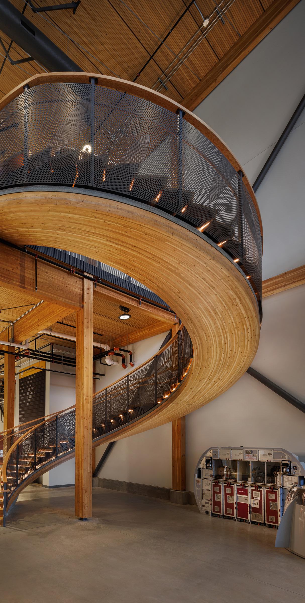 In terms of construction of the new headquarters, Desjardins notes that, “About 37 tractor-trailer deliveries of timber were required for the building, and moisture control for the wood led us to develop a drying system that proved very effective and which we hope to use on future projects.”
