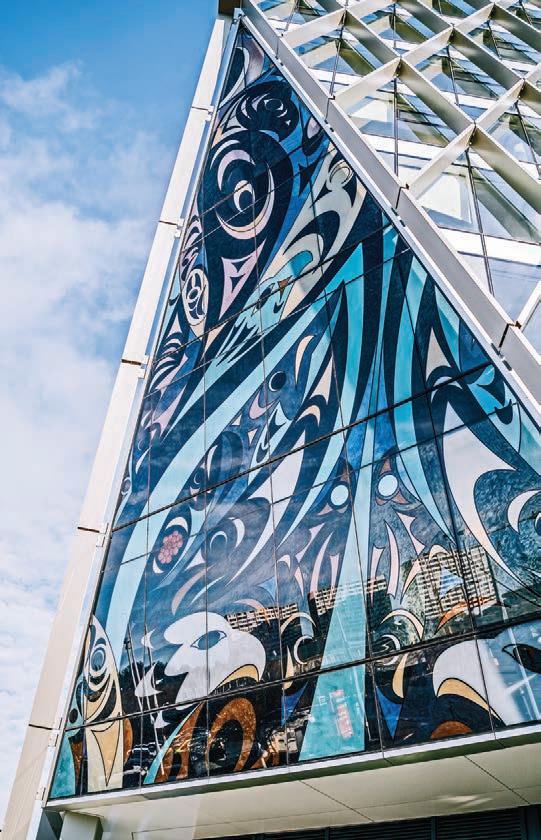 At the entrance, a stunning threemetre-high textile wall hanging by Walpole Island First Nation artist Teresa Altiman welcomes visitors with colourful imagery depicting a connection to the planet. Protecting Mother Earth is a celebration of nature as seen through Indigenous culture, comprised of hundreds of pieces of fabric, some as slender as toothpicks. “It has things in it that are important to me and to the Anishinaabe people,” Altiman says. “The arrowheads represent our ancestors who have walked the land before us. It is important to remember our ancestors and those who came before us.”